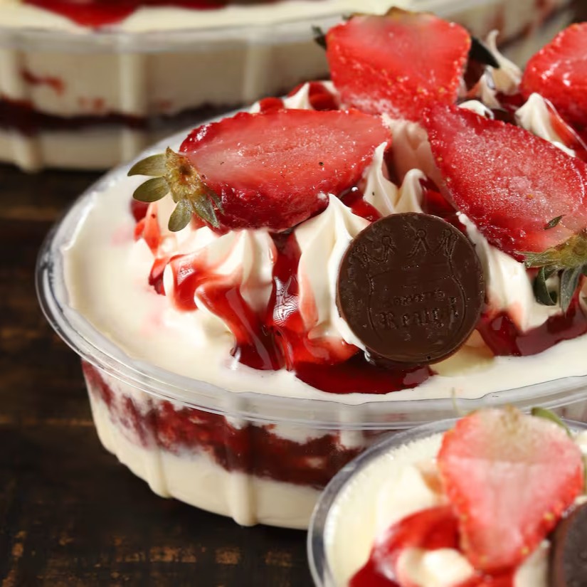 Feita com recheio especial da casa, geleia artesanal de frutas vermelhas e sorvete especial Realçaí. Decorada com chantininho, calda de morango e frutas vermelhas . Serve de 4 a 6 pessoas