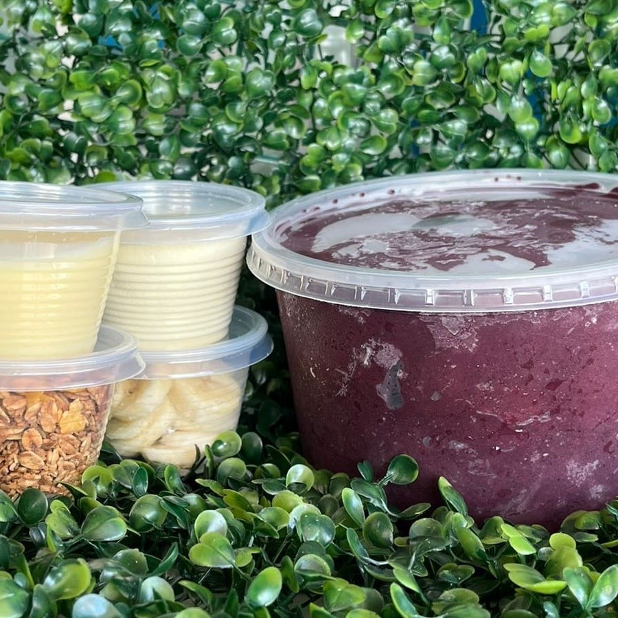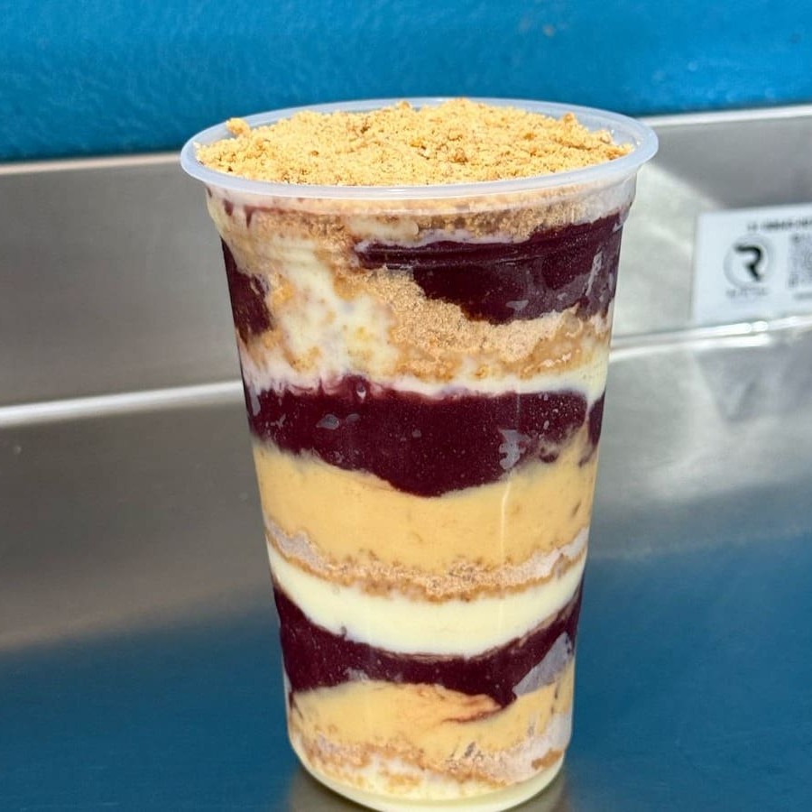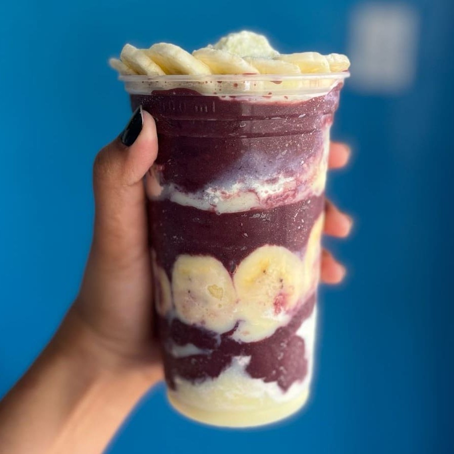Creme de Açaí super cremoso com Leite Condensado, Leite em Pó, Banana e Granola.