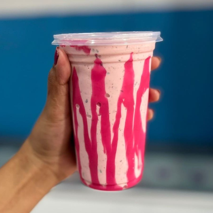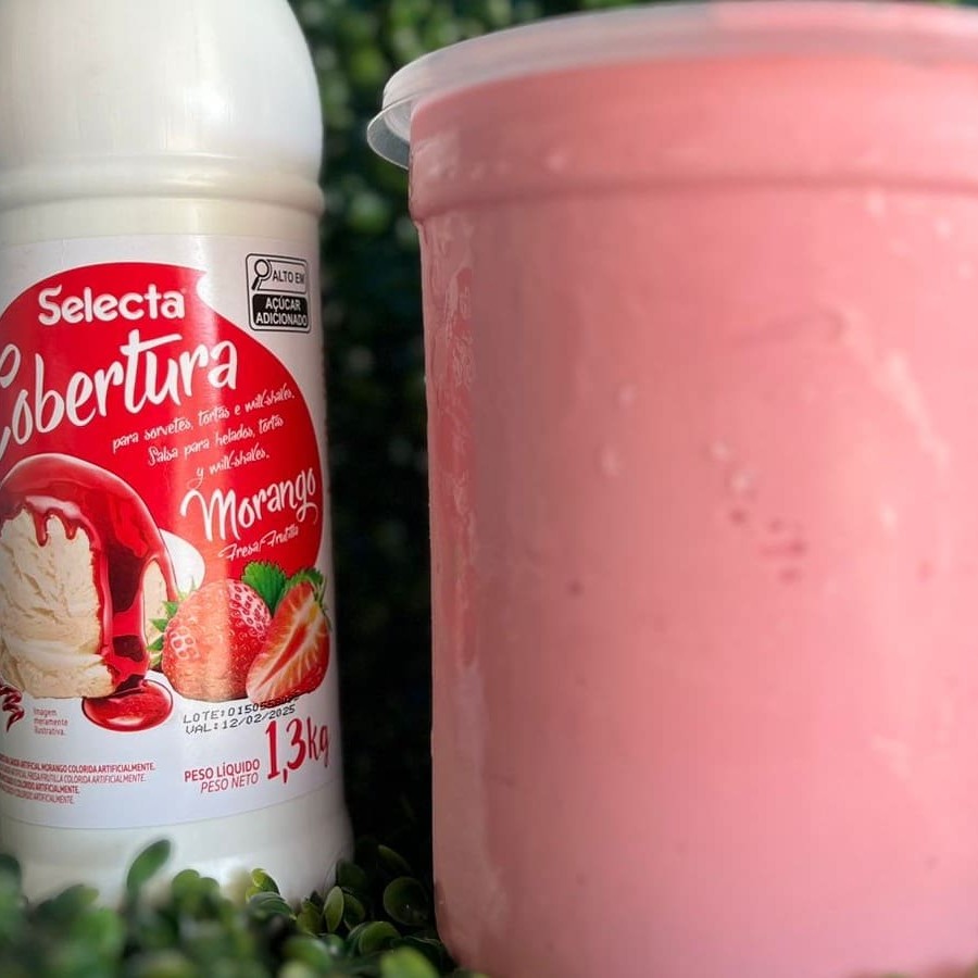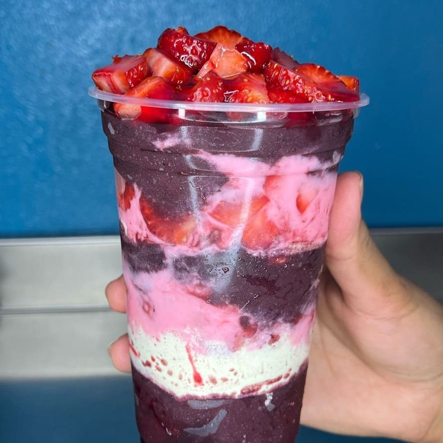 Creme de Açaí super cremoso com Morangos Selecionados um delicioso Creme de Morango, Leite em pó e Calda de Morango.