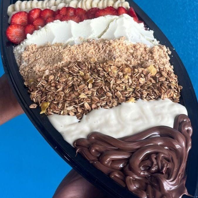 Creme de Açaí acompanhado com Nutella De Verdade, Flocos de Ovomaltine, Leite em Pó, Leite Condensado, Banana e Granola.