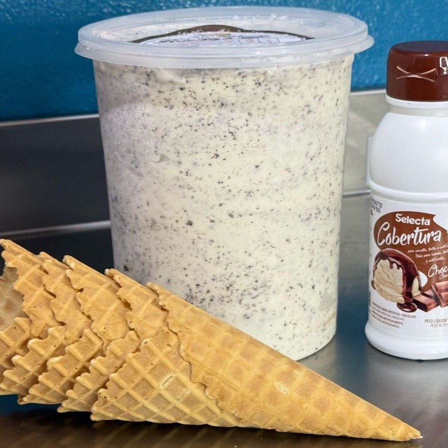 2 Litros de sorvete, 5 cascões, 1 cobertura 300g.