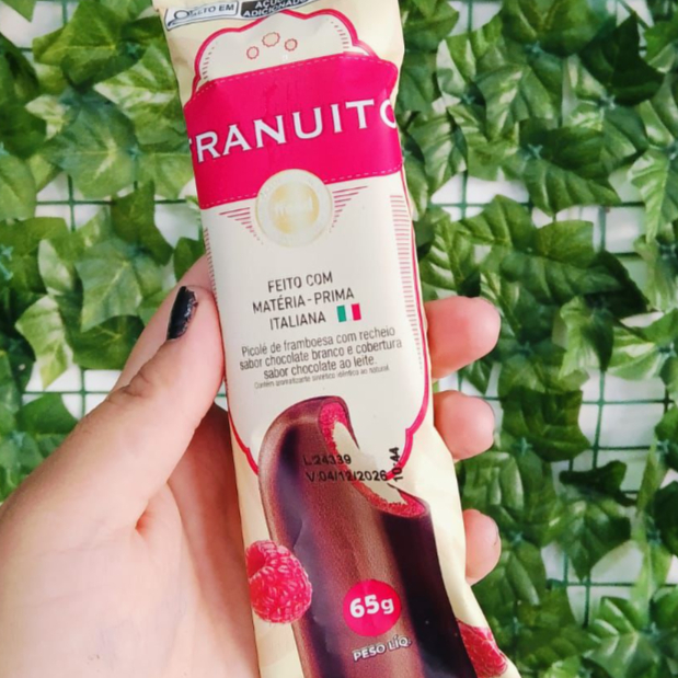 PICOLÉ DE FRAMBOESA COM RECHEIO SABOR DE CHOCOLATE BRANCO E COBERTURA SABOR CHOCOLATE AO LETE