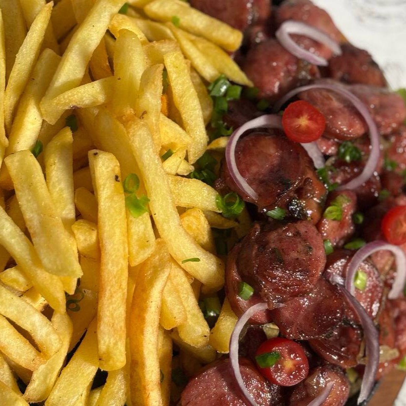 macarrão na chapa, macarrão espaguete, linguiça calabresa defumada, vinagrete, muçarela.