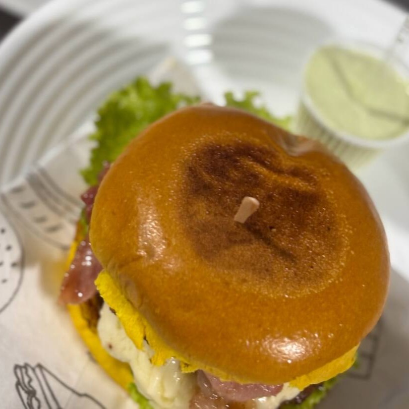 Pão tostado, blend de picanha 90g, queijo muçarela, ovo, bacon fatia, batata palha, alface e tomate.