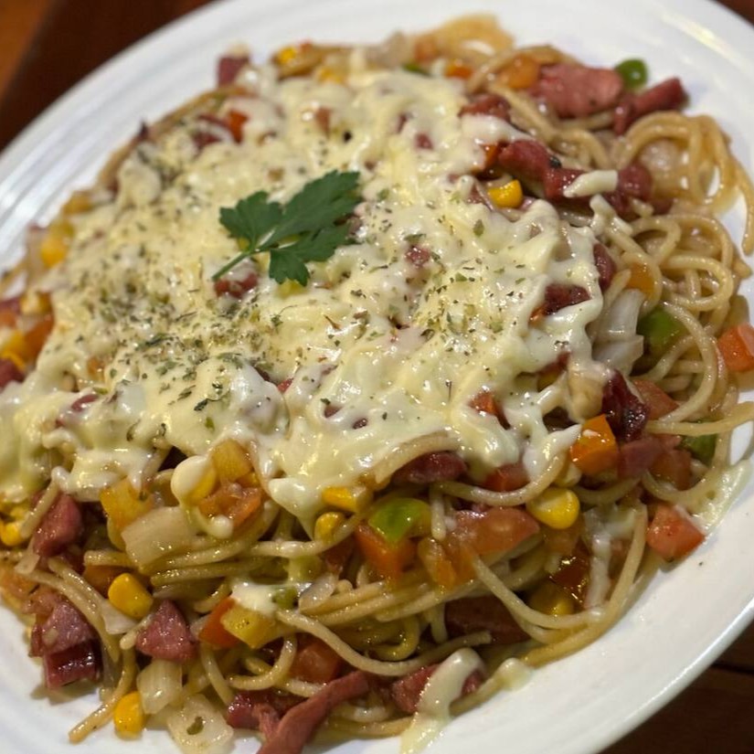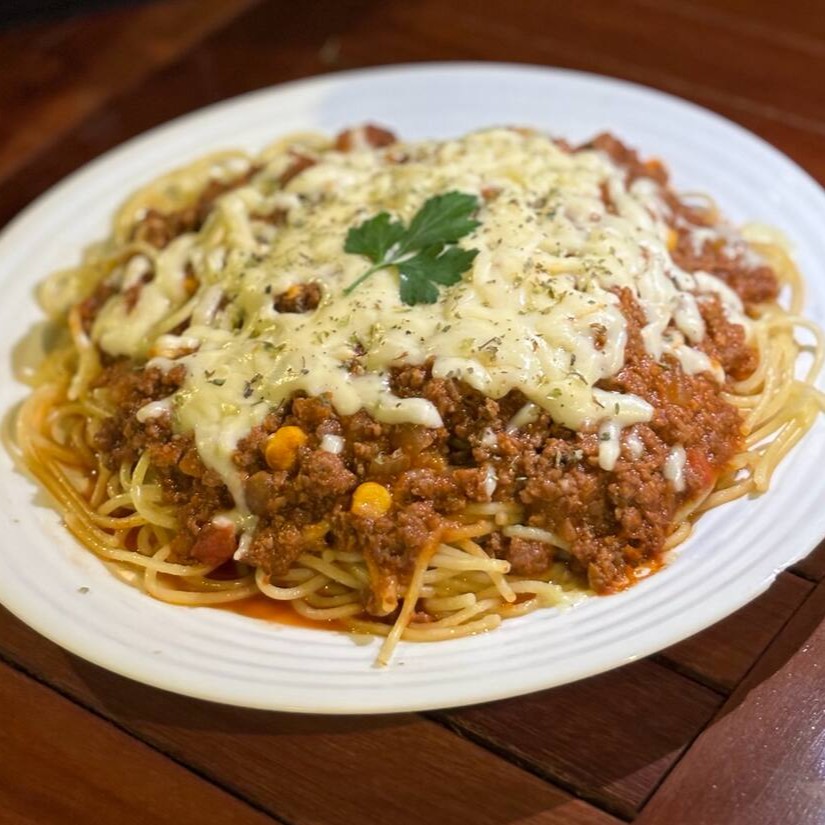 Macarrão espaguete, molho de carne bolonhesa, queijo muçarela e cheiro verde.