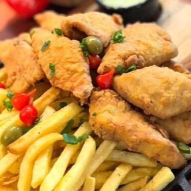 File de tilapia empanado mais fritas com temperinho da casa, 800grs, acompanha molho verde da casa.