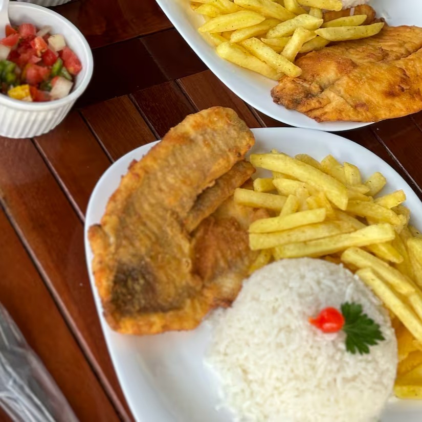 File de tilapia, arroz branco soltinho, batata frita, farofa recheada e vinagrete.