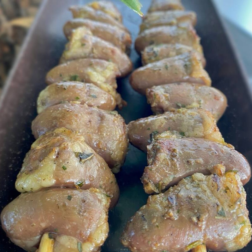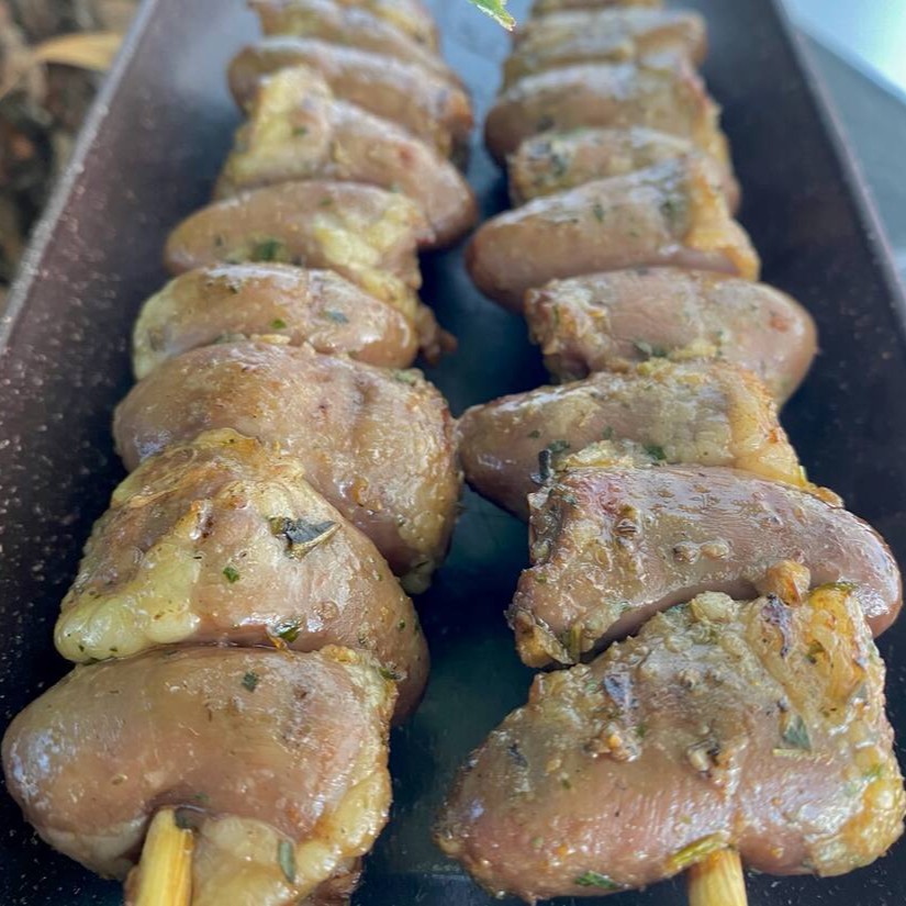 2 Espetinhos de coração, marinados com delicioso tempero da casa, suculentos e saborosos