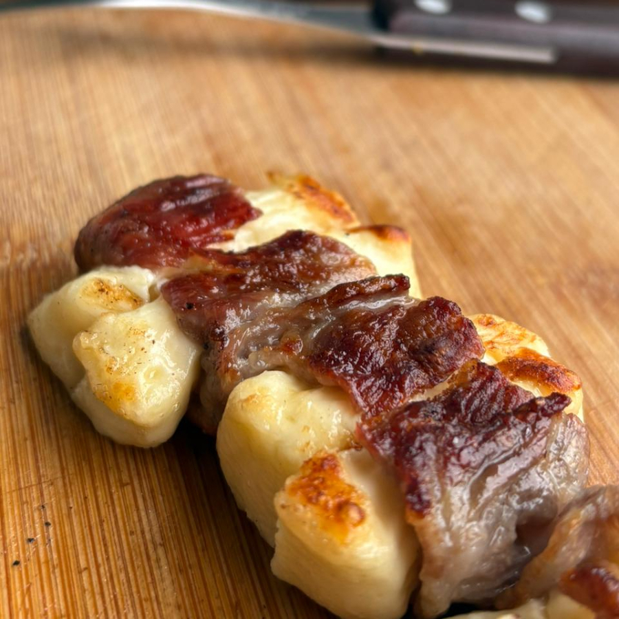 Uma verdadeira explosão de sabores. Nosso Espetinho de Medalhão de Batata Recheada é um daqueles que você não pode deixar de experimentar. A Batata é enrolada pelo Bacon em forma de medalhão com recheio interno de queijo cheddar. Venha experimentar mais um dos nossos sucessos!