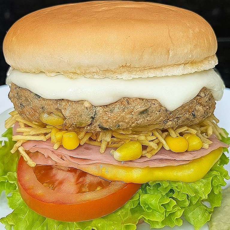 Pão Vegano, Hamburguer Vegano (Soja, Grão de bico , Feijao Preto , Lentilha , Abobora), Antepasta ( Humus ou Pesto), Presunto Vegano, Bacon Vegano, Mussarela cremosa Vegana, fruta (abacaxi ou passas), Batata Palha, Milho, Alface e Tomate