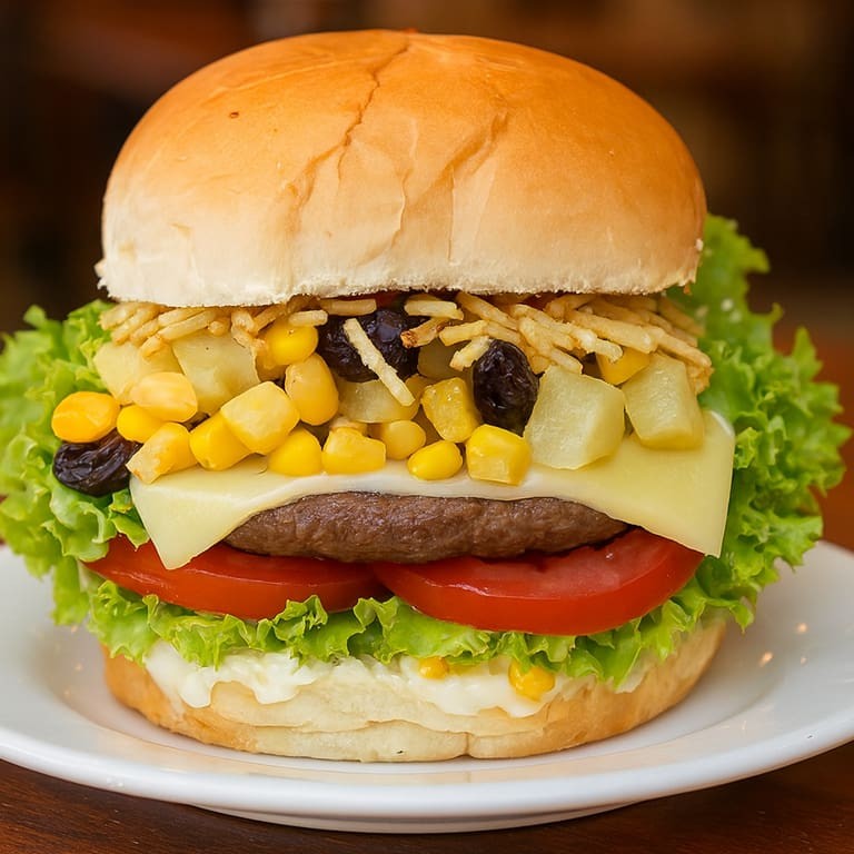 Pão, hambúrguer, queijo, abacaxi, passas, batata, milho, alface, tomate.