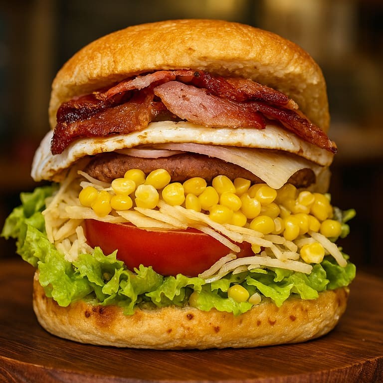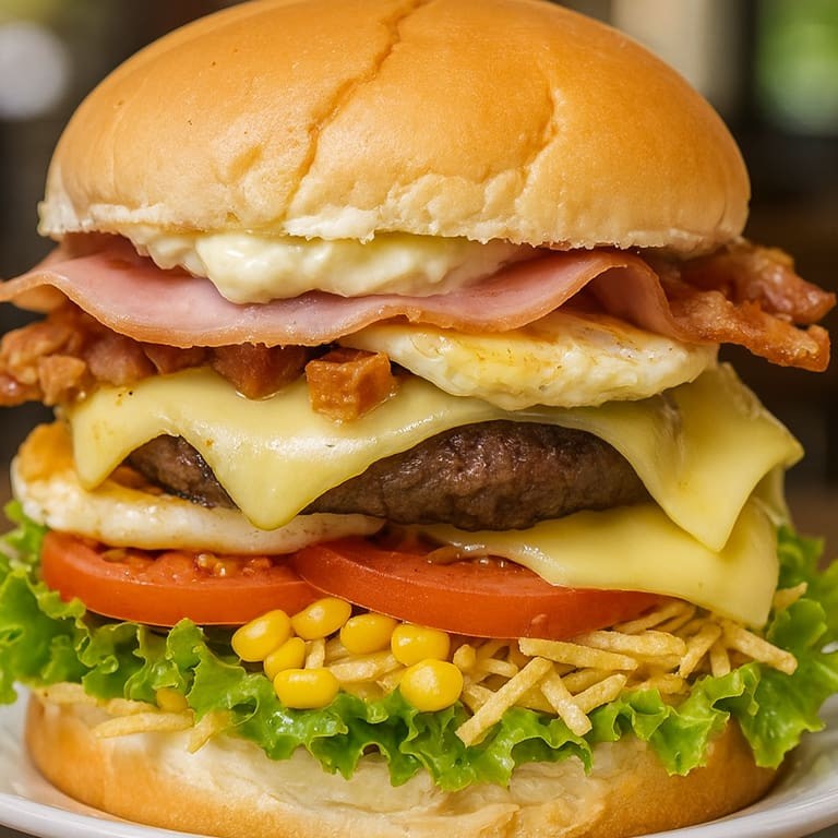 Pão, hambúrguer, queijo, presunto, ovo, batata palha, milho, alface, tomate.