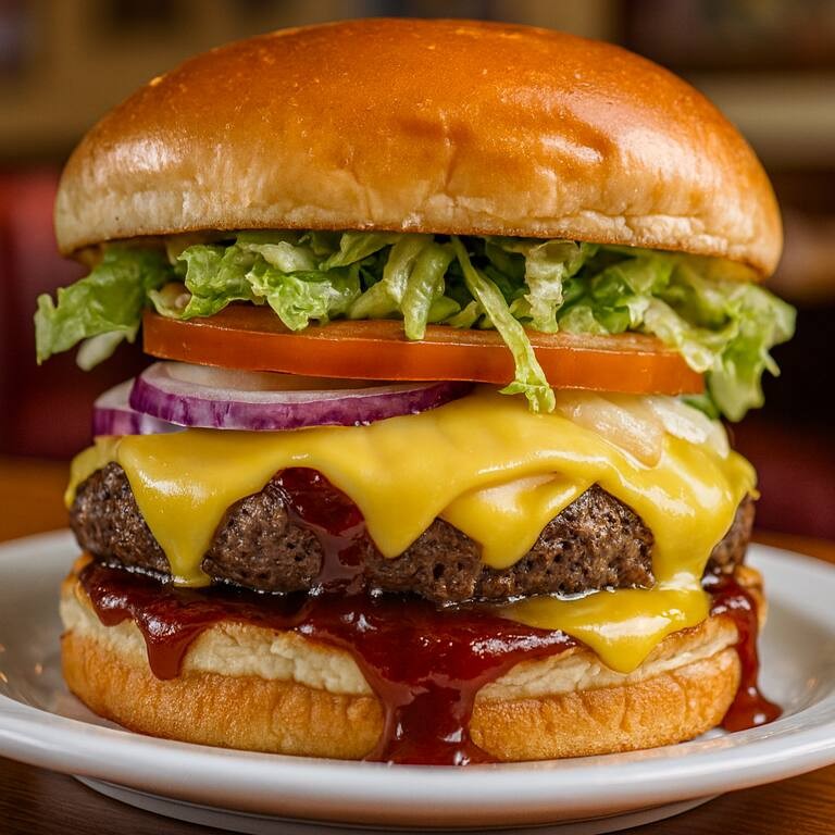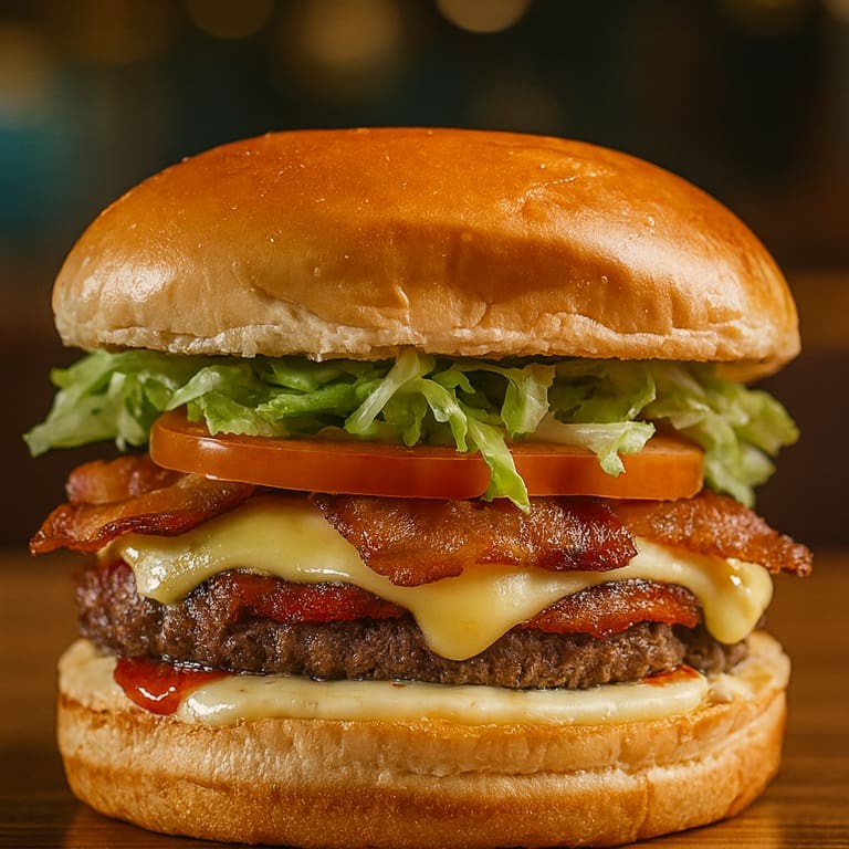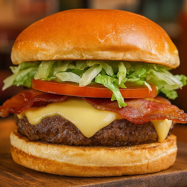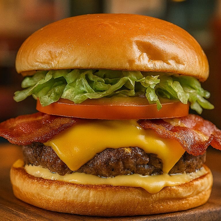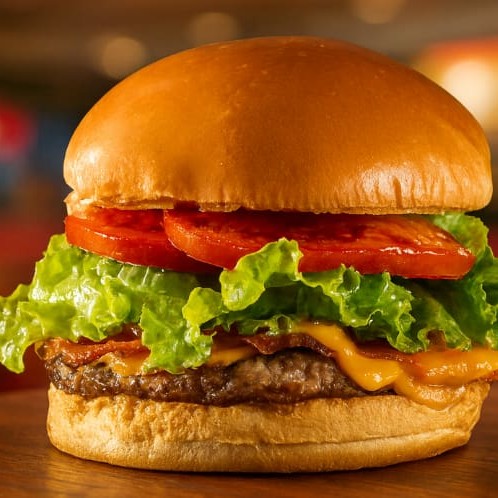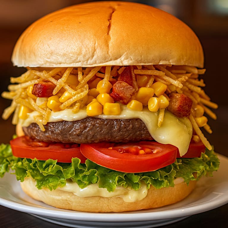 Pão, hambúrguer, queijo, bacon, batata, milho, alface, tomate.