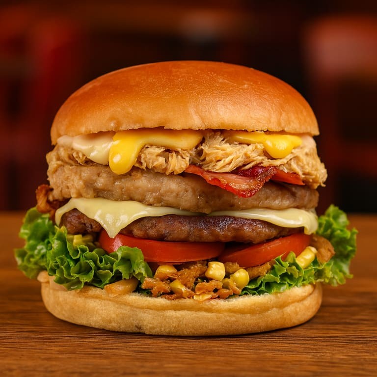 Pão, frango desfiado, hamburguer bovino, bacon, queijo, batata, milho, alface e tomate.