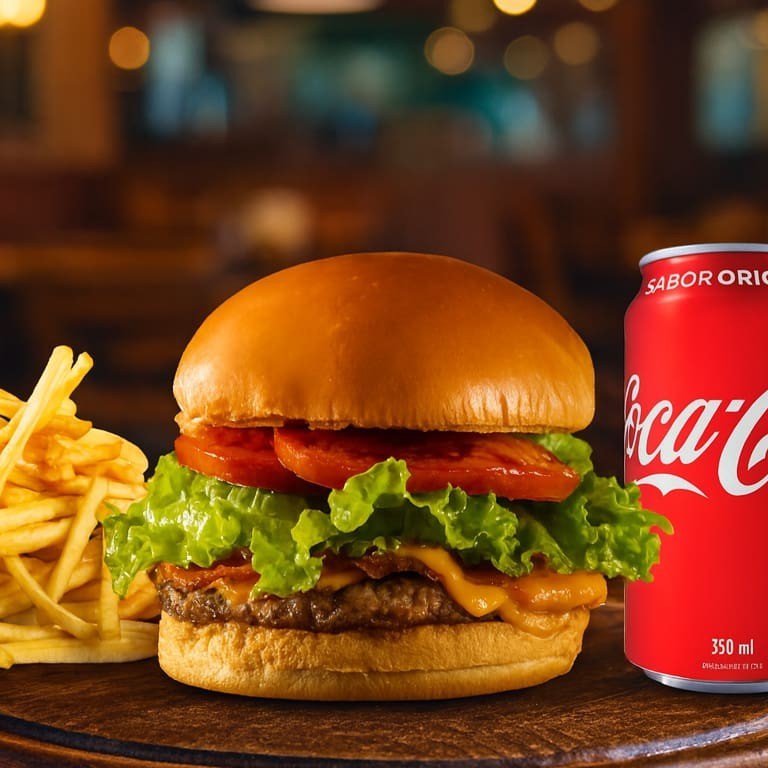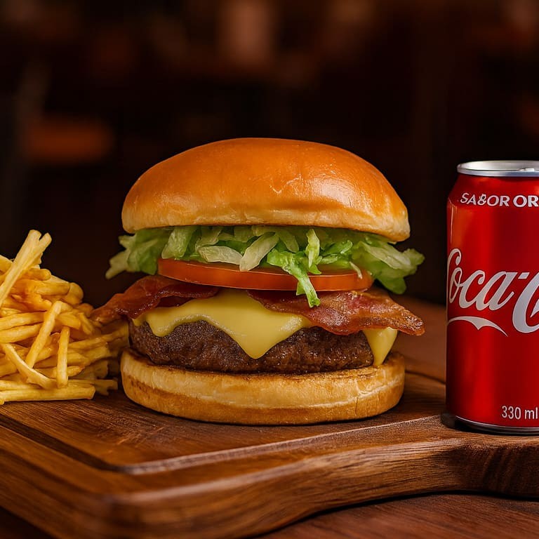 Pão, hambúrguer 90g , queijo, ovo, bacon, batata palha, milho, alface e tomate. Batata frita crocante e dourada e bebida geladinha.