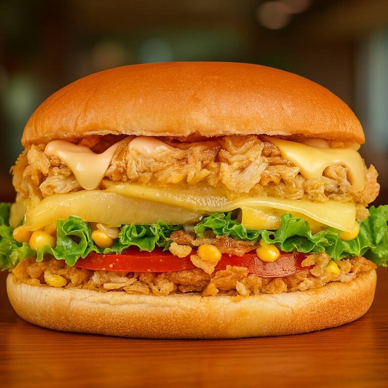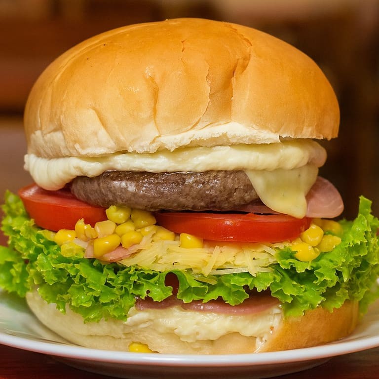 Pão, hambúrguer, queijo, batata, milho, alface, tomate.