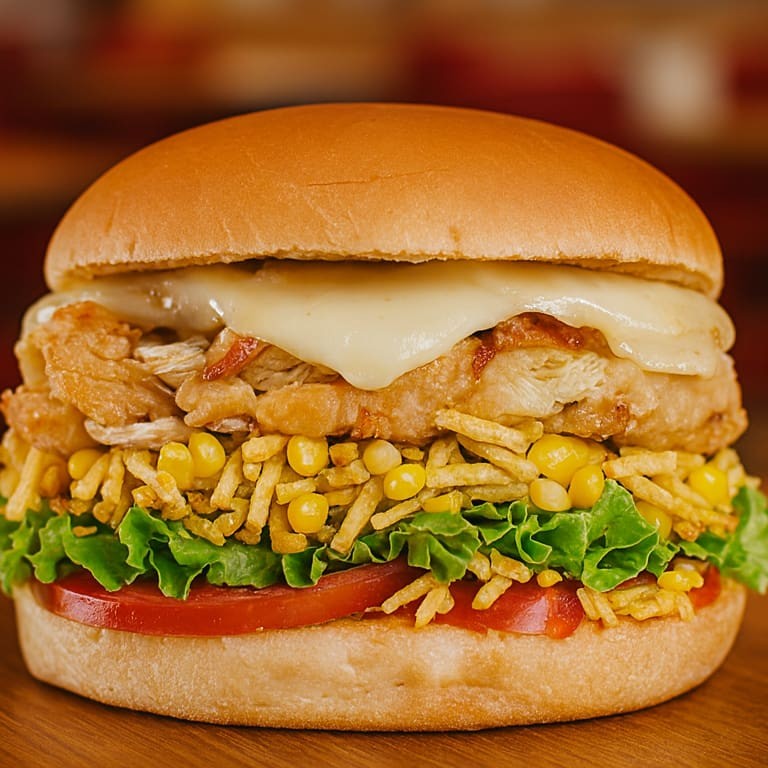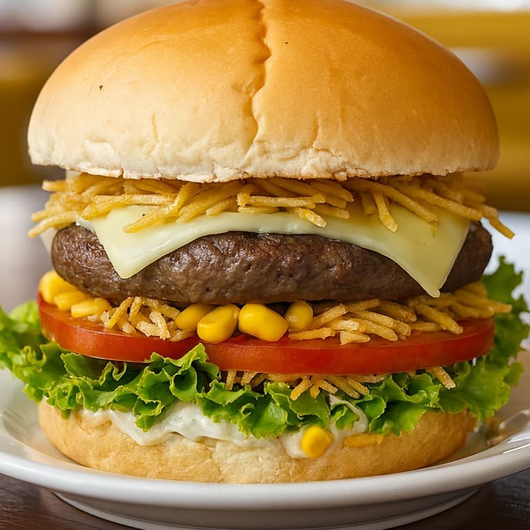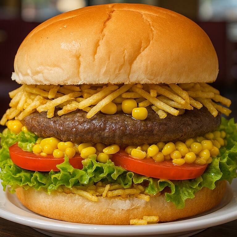 Pão, hambúrguer, batata palha, milho, alface e tomate.
