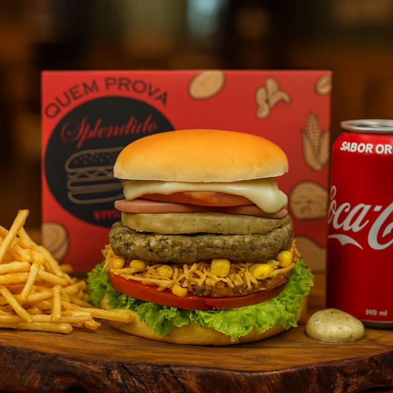 O 'Splendido 3' é uma obra-prima de nossos 'Sanduíches Artesanais'. Compõe-se de um pão Brioche macio e dourado, recheado com um generoso hambúrguer artesanal de 200g, suculento e saboroso. Acompanha o exclusivo Molho Especial da Casa, uma receita secreta que adiciona um toque irresistível ao conjunto. Adicionamos ainda uma camada de queijo mussarela derretido para criar uma textura cremosa irresistível. E, para completar, a crocância do bacon e a frescura do alface e tomate, oferecendo um equilíbrio perfeito de sabores e texturas. Aventure-se neste delicioso sanduíche e experimente o sabor da arte culinária em cada mordida.