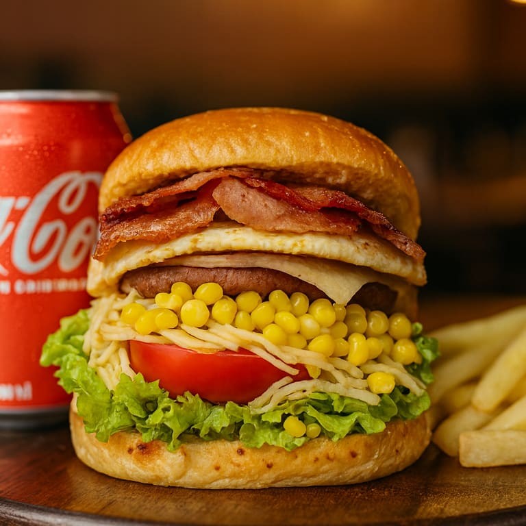 Pão, hambúrguer, queijo, ovo, bacon, batata palha, milho, alface, tomate.