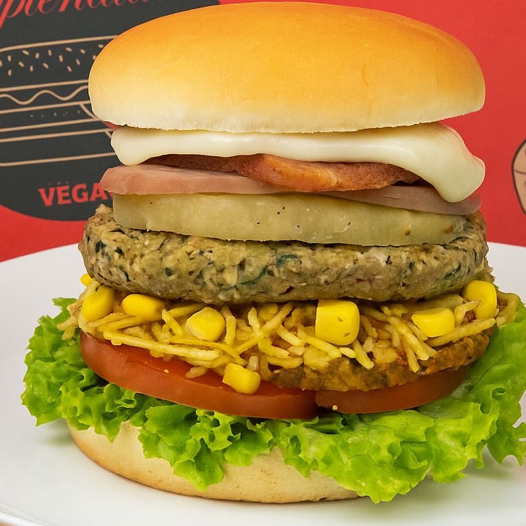 Pão Vegano, Hamburguer Vegano (Abobora, Grão de Bico ou Feijao Preto ou Lentilha ou Soja), Anti Pasta ( Humus ou Pesto), Bacon Vegano , Mussarela cremosa Vegana, fruta (abacaxi ou passas), Batata Palha, Milho, Alface e Tomate