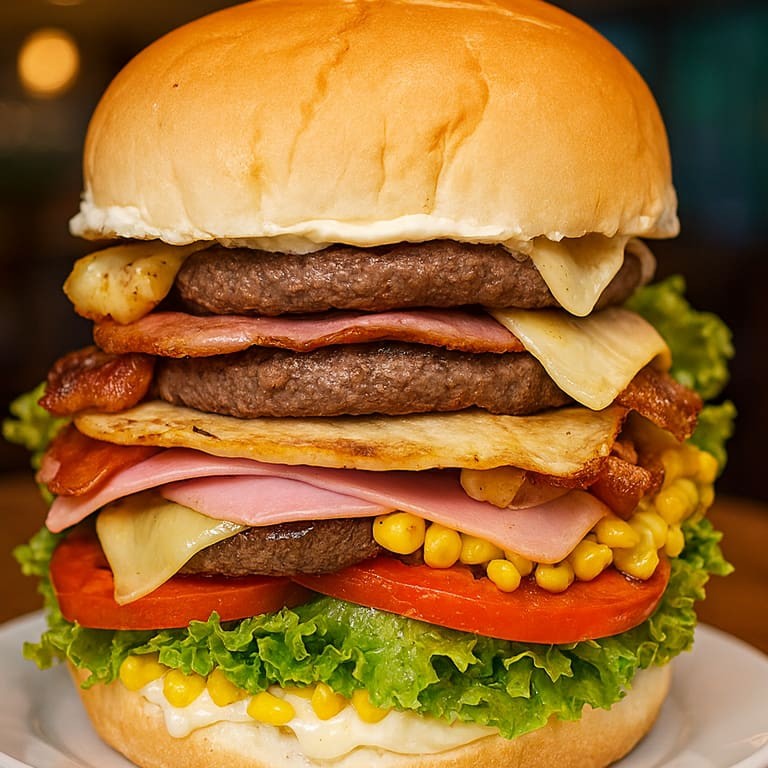 Pão, 3 hambúrgueres, Catupiry, frango desfiado, presunto, ovo, batata, milho, alface e tomate.