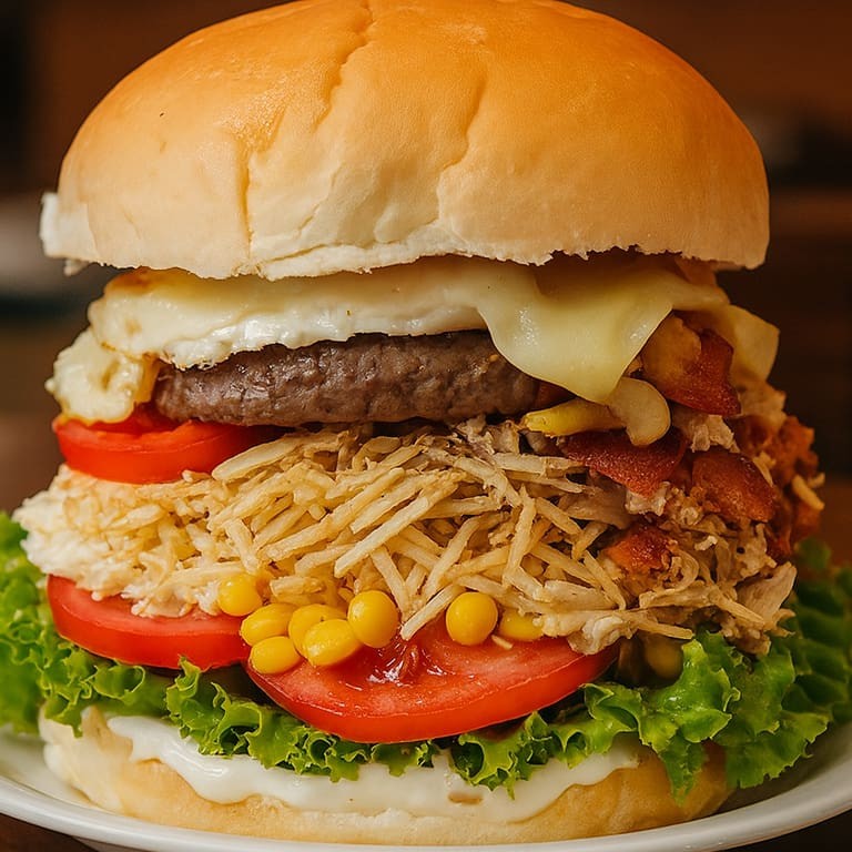 Pão, hambúrguer, frango desfiado, queijo, presunto, bacon, ovo, batata palha, milho, alface, tomate.