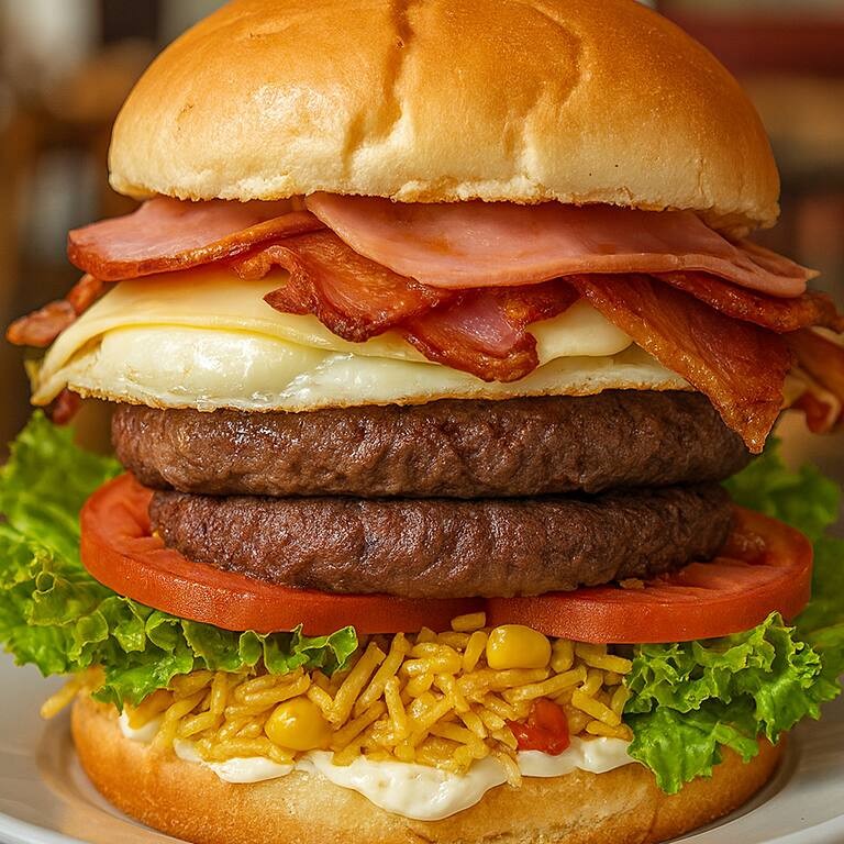 Pão 2 hamburguers ,queijo, presunto, ovo, bacon, batata palha, milho, alface e tomate.