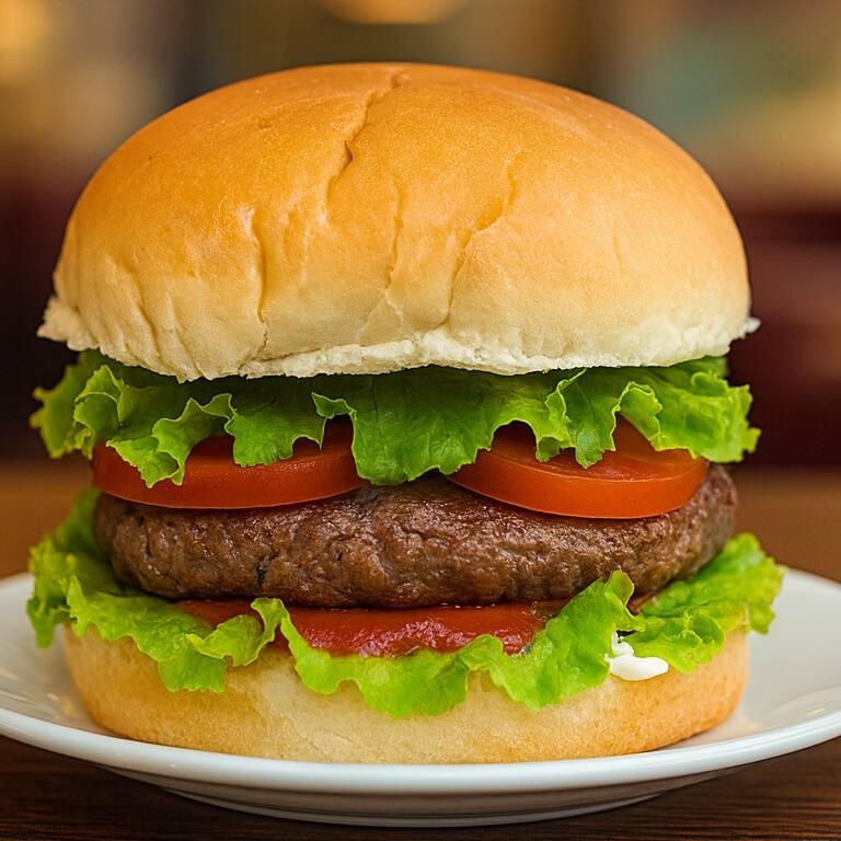 Pão, hambúrguer, queijo, ovo, batata, milho, alface, tomate.