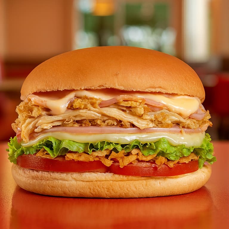 Pão, frango desfiado, hamburguer bovino, bacon, queijo, batata, milho, alface e tomate.