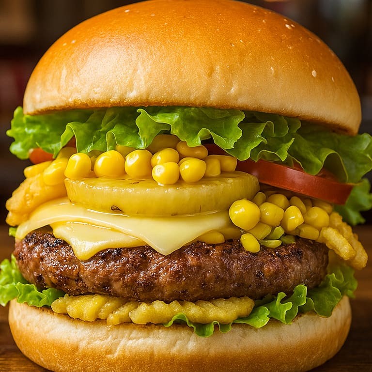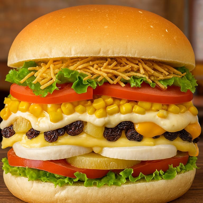 Pão, hambúrguer, queijo, abacaxi, passas, batata, milho, alface, tomate.
