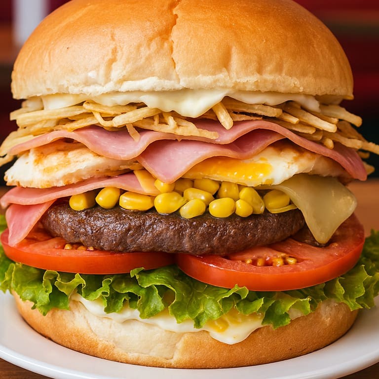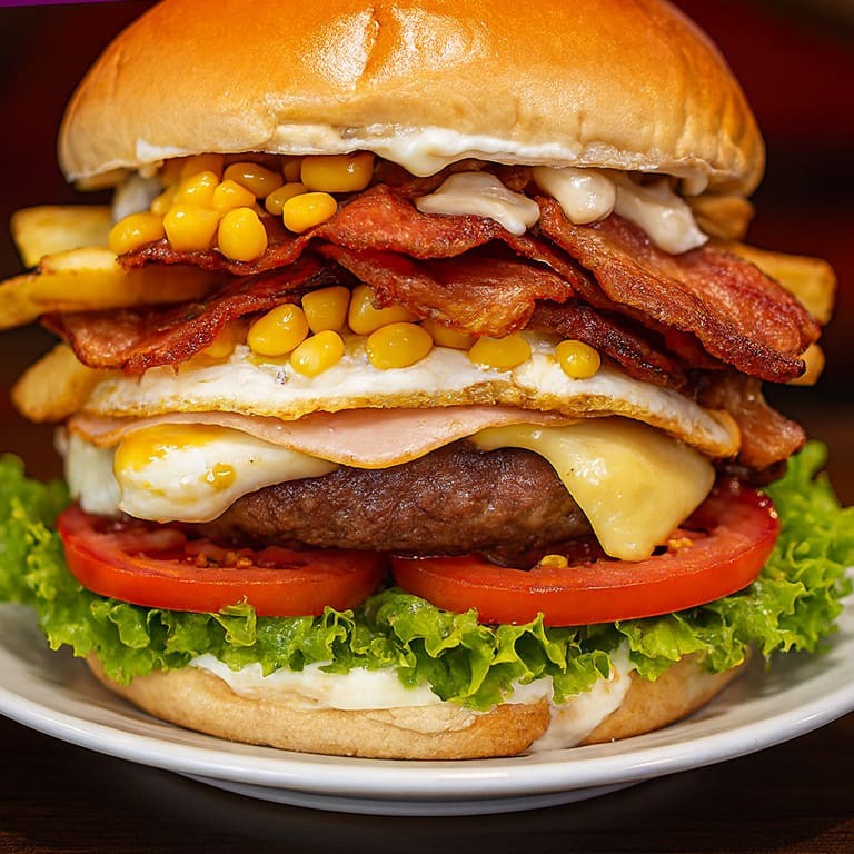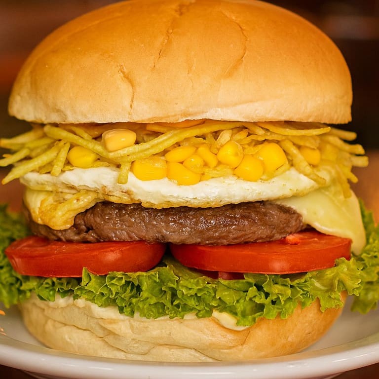 Pão, hambúrguer, queijo, presunto, ovo, batata palha, milho, alface, tomate.