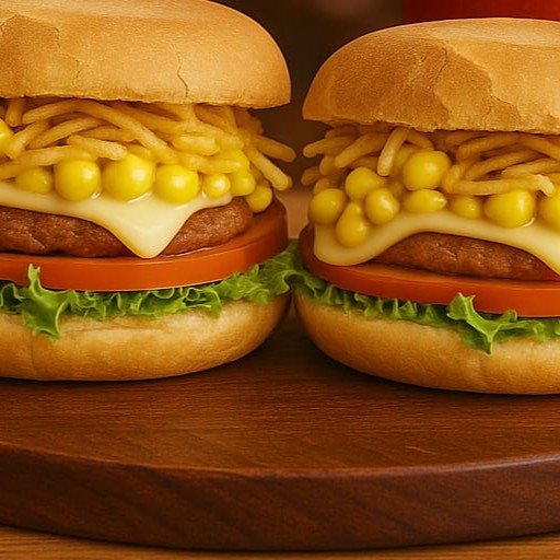 Pão, hambúrguer, queijo, batata, milho, alface, tomate.