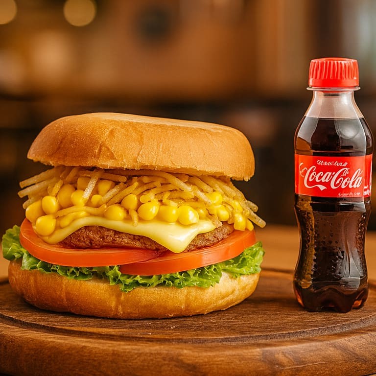 Pão, hamburguer bovino 50g, queijo, batata palha, milho, alface e tomate.