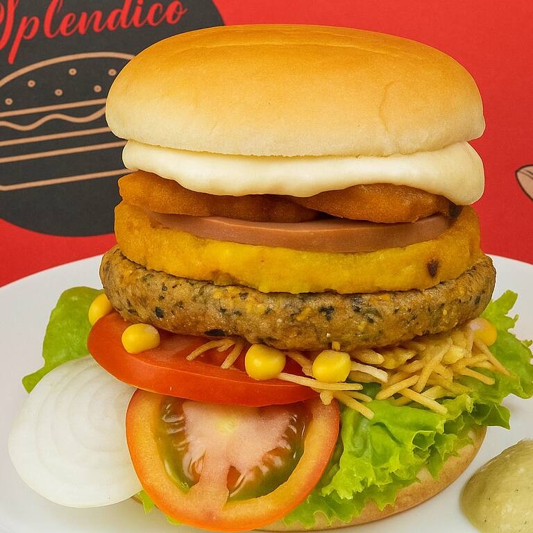 Pão Vegano, Hamburguer Vegano (Soja, Grão de bico , Feijao Preto , Lentilha , Abobora), Antepasta ( Humus ou Pesto), Presunto Vegano, Bacon Vegano, Mussarela cremosa Vegana, fruta (abacaxi ou passas), Batata Palha, Milho, Alface e Tomate