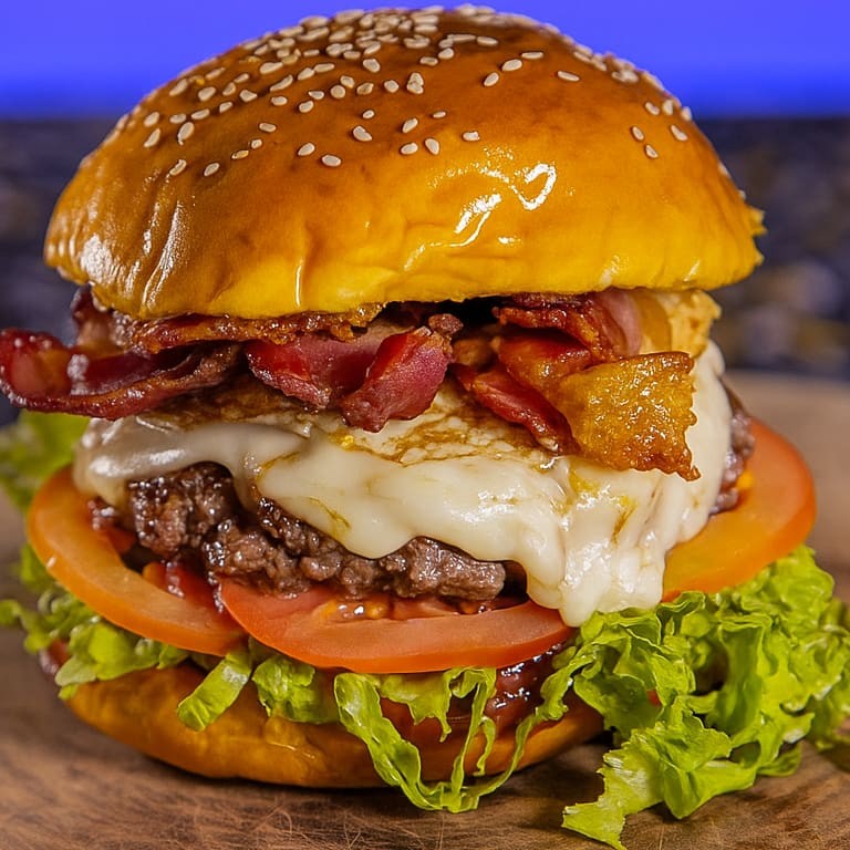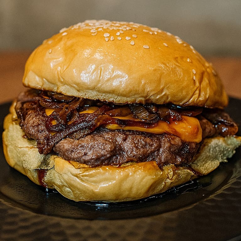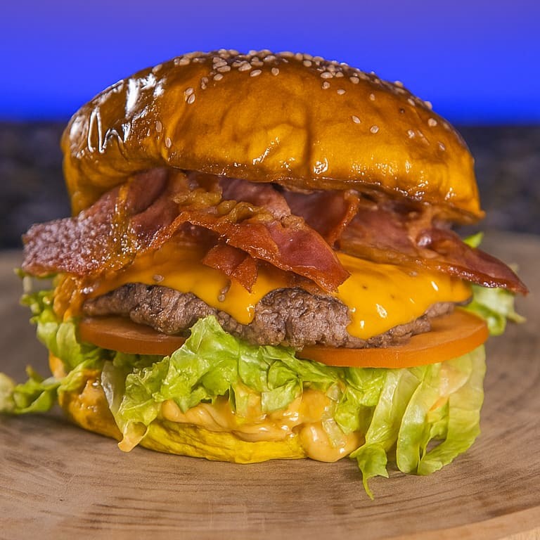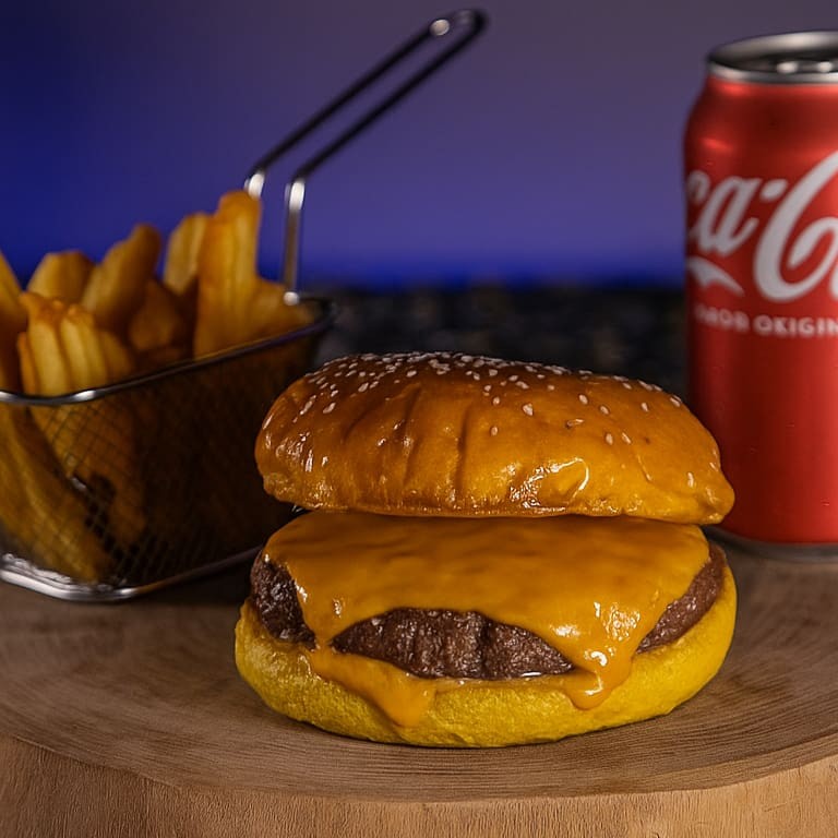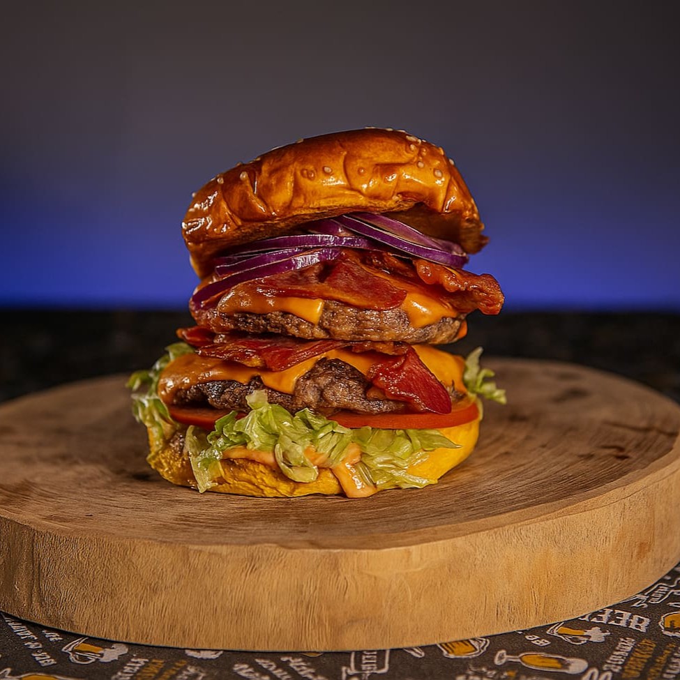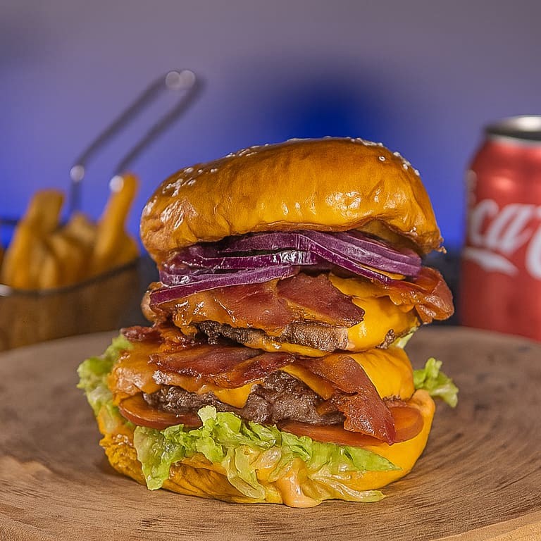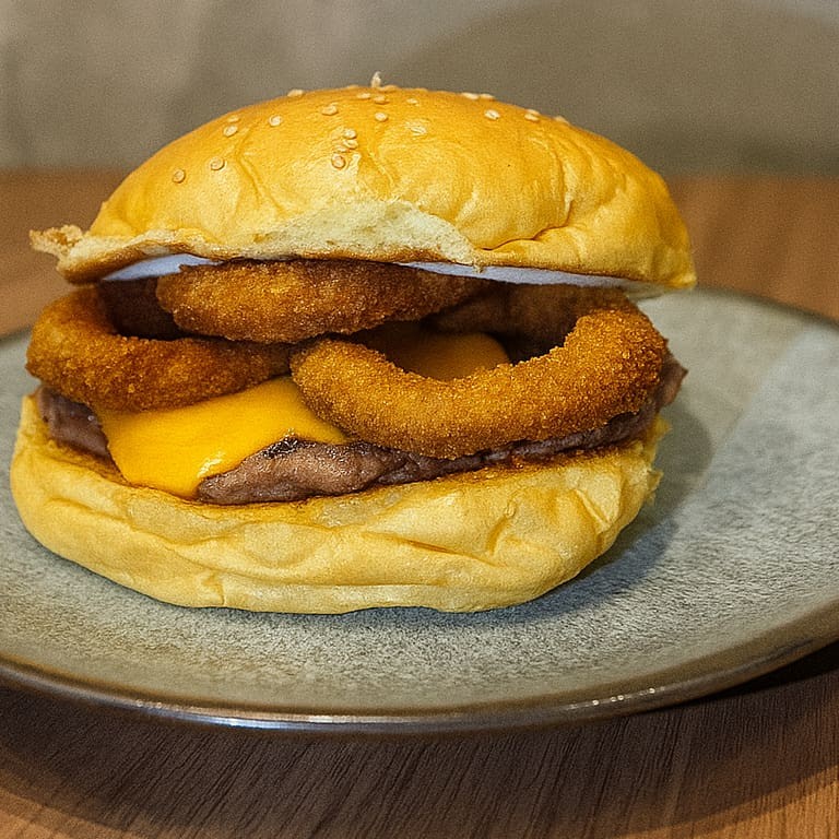 Pão brioche macio e fofinho, suculento blend bovino, anéis de cebola crocantes que dançam com o cheddar derretido e aquela maionese da casa que transforma cada mordida em puro êxtase!