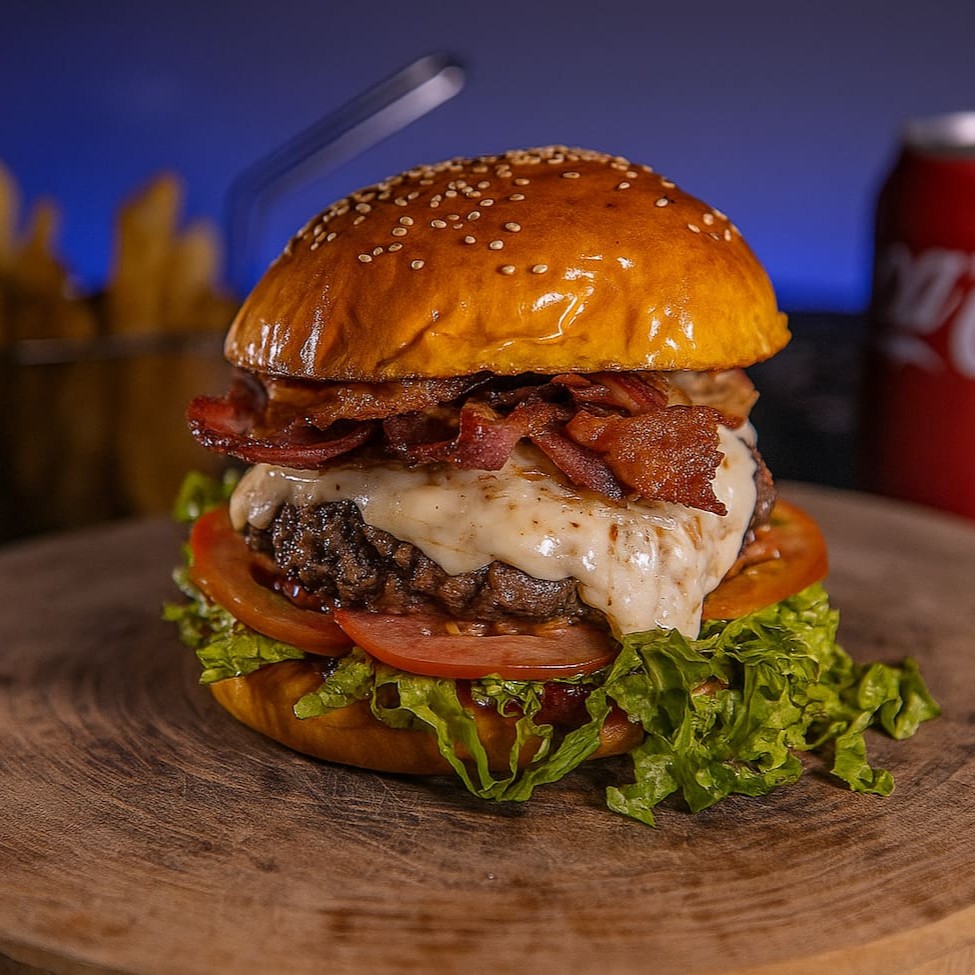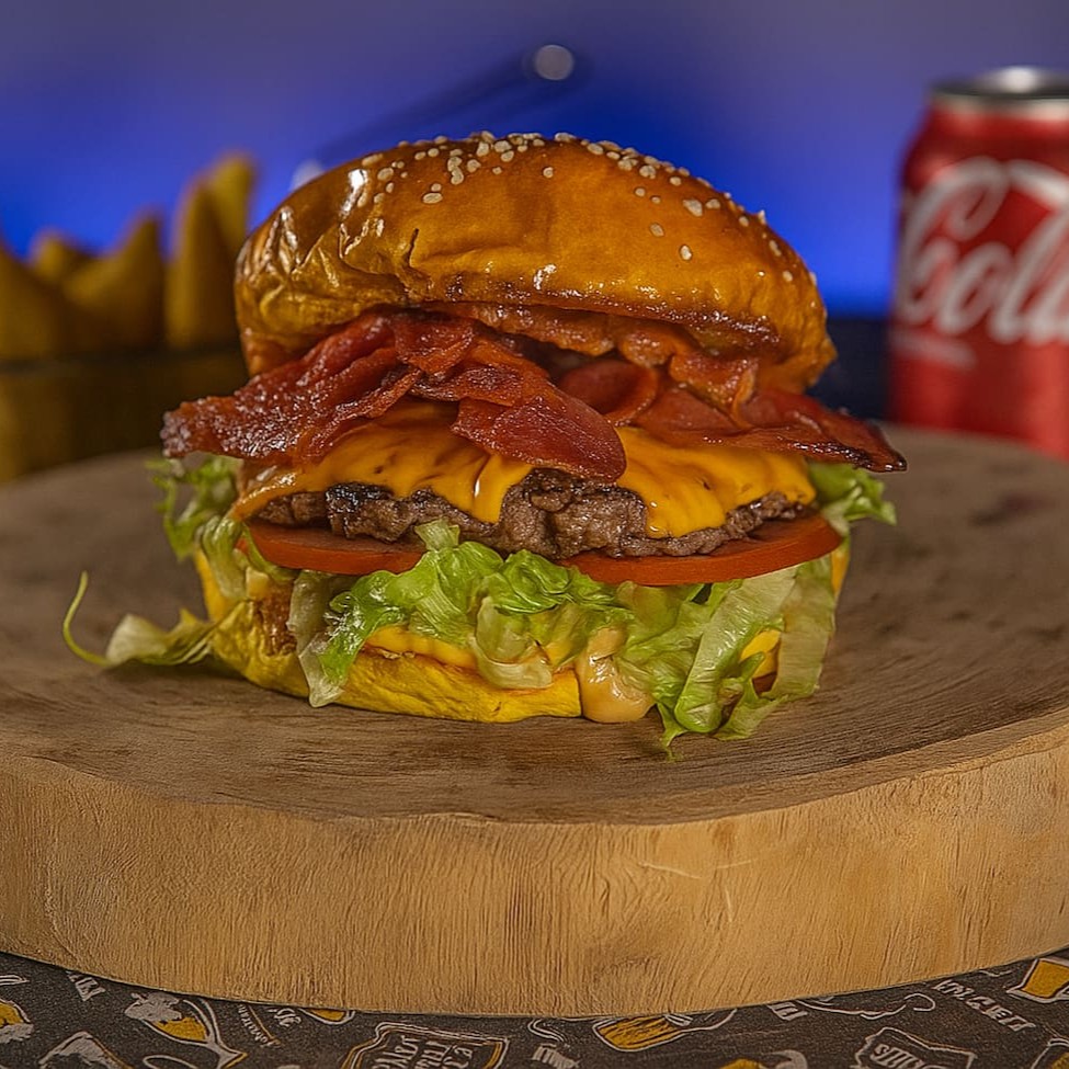 Pão De Brioche selado, macio e gostoso, recheado com Molho Especial feito com nossa Maionese da Casa, Blend Bovino de 120g "caprichadamente" feito com Tempero Especial do Cheff, salpicado com Mix de Pimentas e coberto por uma fatia de Queijo Cheddar derretido e Bacon crocante!