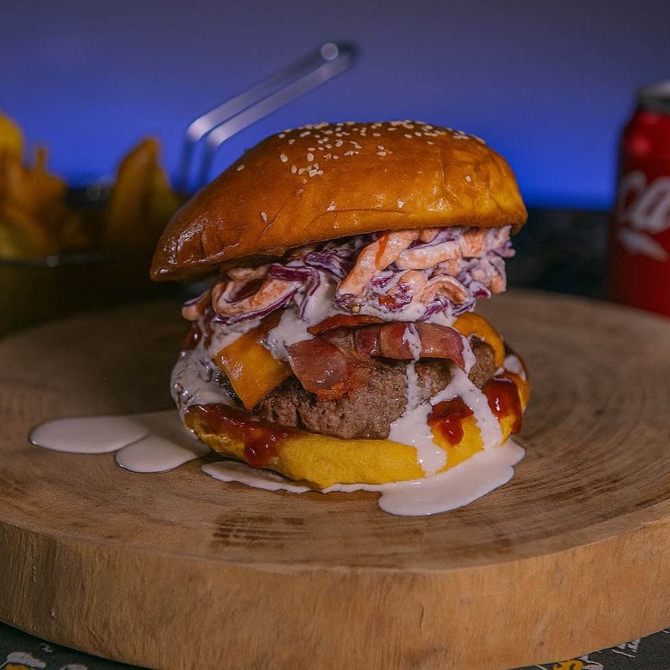 Delicioso e fofinho Pão De Brioche selado, generosa camada do molho mais saboroso da galaxia, Molho Barbecue, Blend Bovino de 120g preparado cuidadosamente ao ponto, com o tempero especial do Cheff e um toque de Mix de Pimentas. Queijo Cheddar deliciosamente derretido, fazendo companhia à finas e crocantes fatias de Bacon, que celebram nosso Coleslaw: salada Texana a base de Cenouras Frescas e raladas, Repolho Roxo curado e crocante, Cebola Roxa e nossa m.a.r.a.v.i.l.h.o.s.a Maionese de alho!