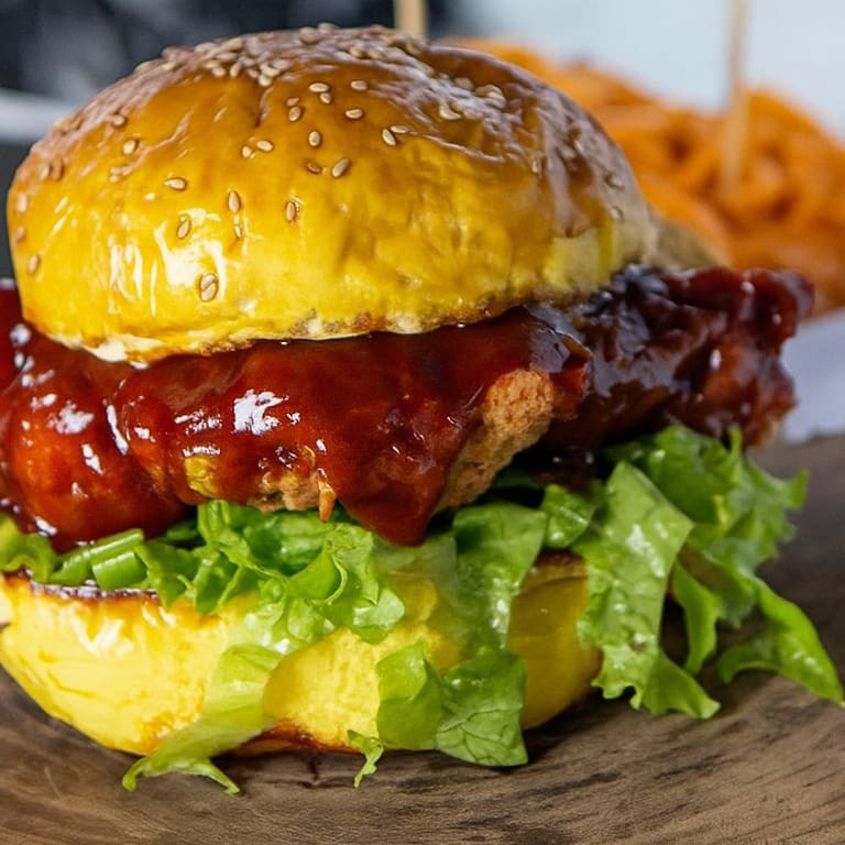 No nosso mesmo pão brioche caseirinho e macio, sobre uma camada generenosa da nossa maionese da casa famosinha, elaaaa, 120g de sobrecoxa desossada, empanada, frita e cuidadosamente envolta no molho agridoce do cheff, coberta por finas fatias de alface fresquinhas e crocantes prontos para te envolver como num abraço!! Suculento e saboroso em cada mordida!