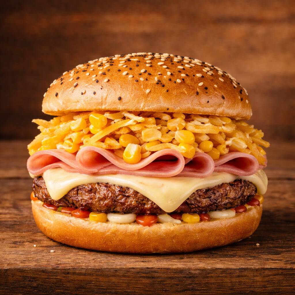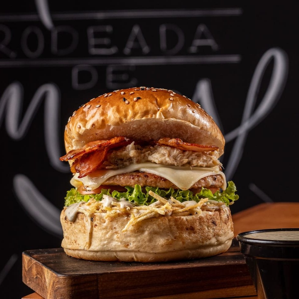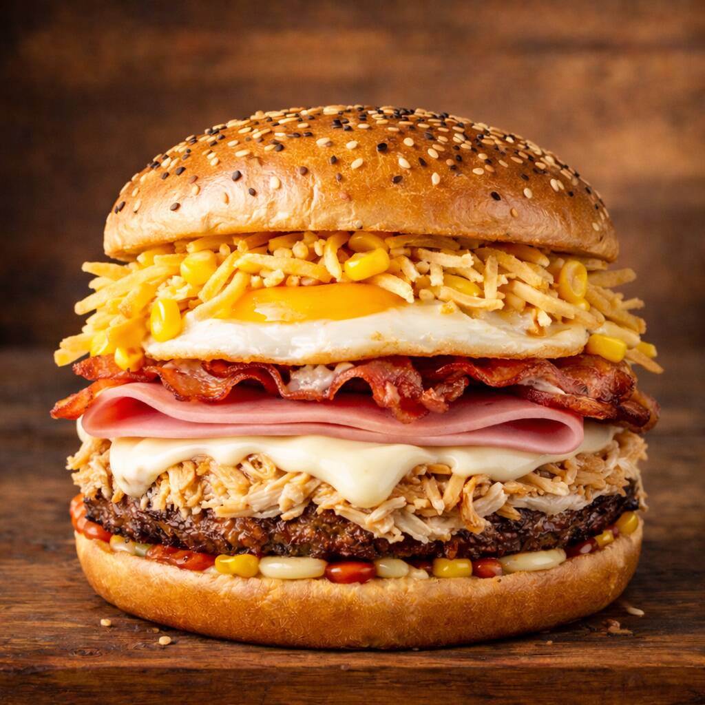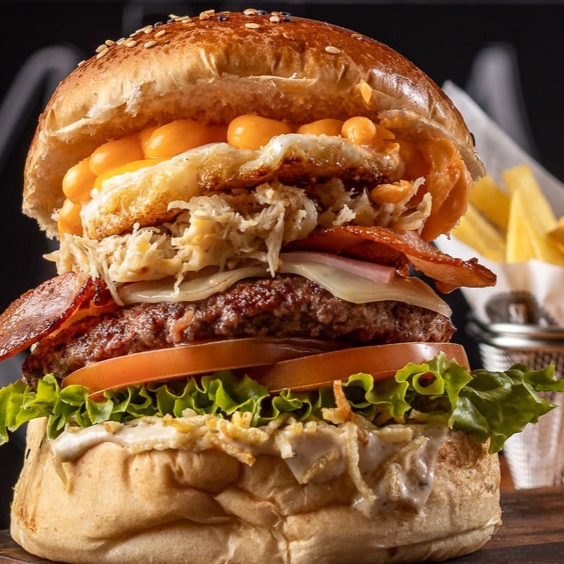 Pão com gergelim, Carne tradicional 90g de picanha, mussarela, presunto, frango desfiado com catupiry, ovo, bacon em fatias, alface, tomate, batata palha, milho, bbq e maionese da casa.