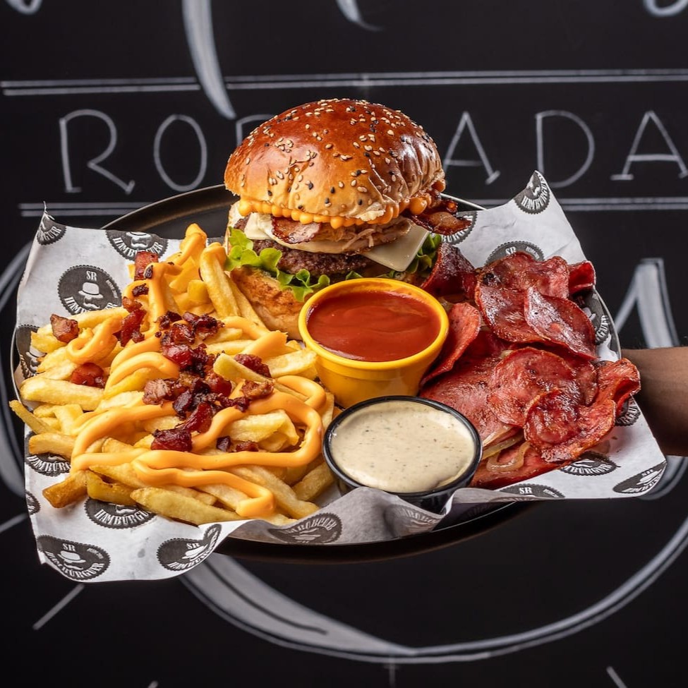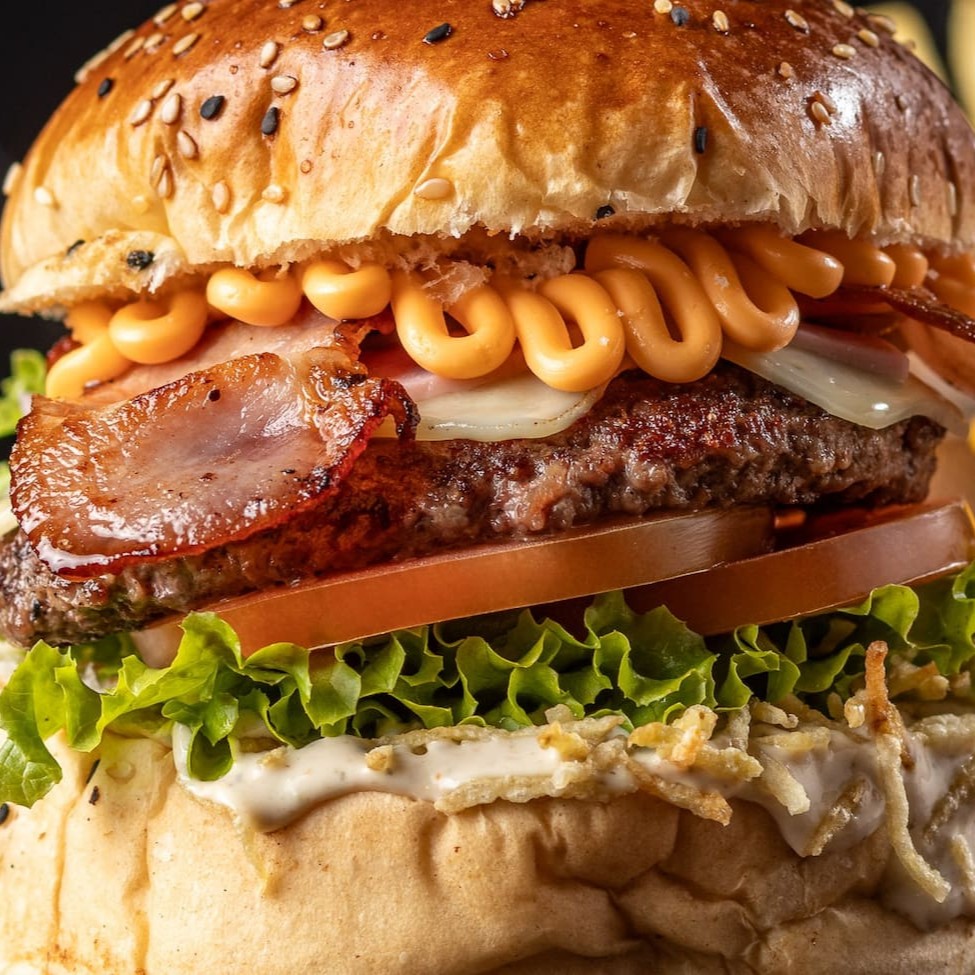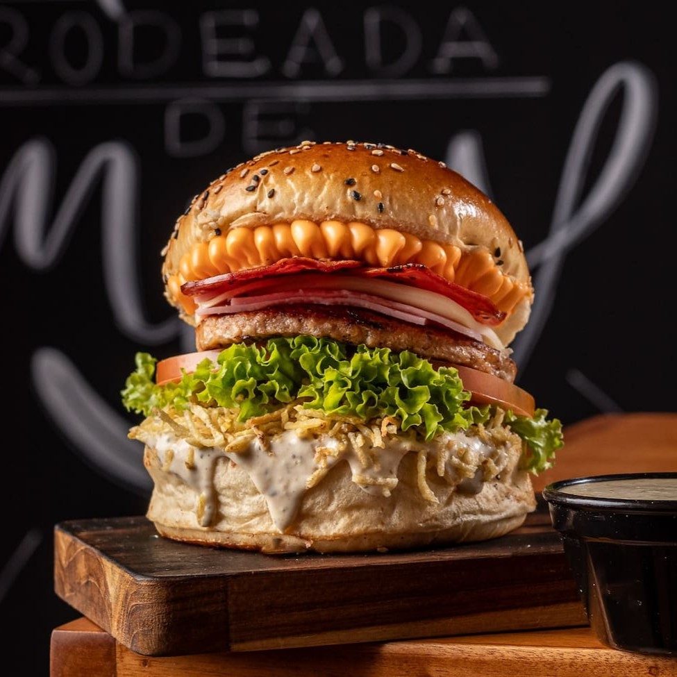 Pão com gergelim, Carne tradicional 90g de picanha, mussarela, presunto, frango desfiado com catupiry, ovo, bacon em fatias, alface, tomate, batata palha, milho, bbq e maionese da casa.