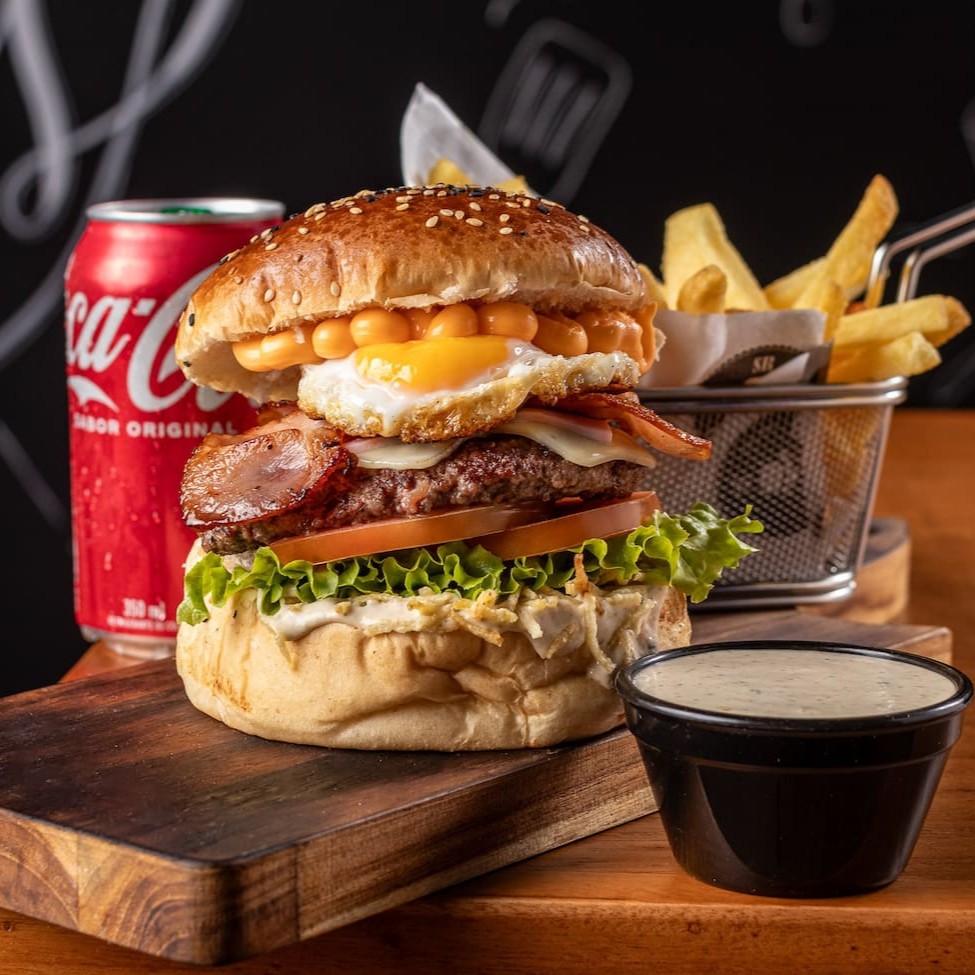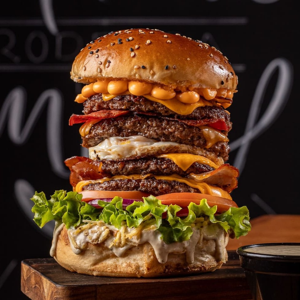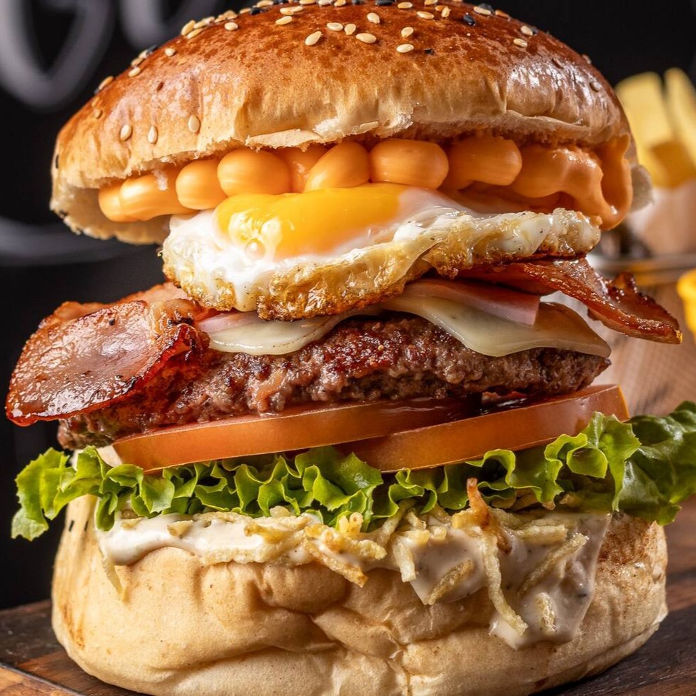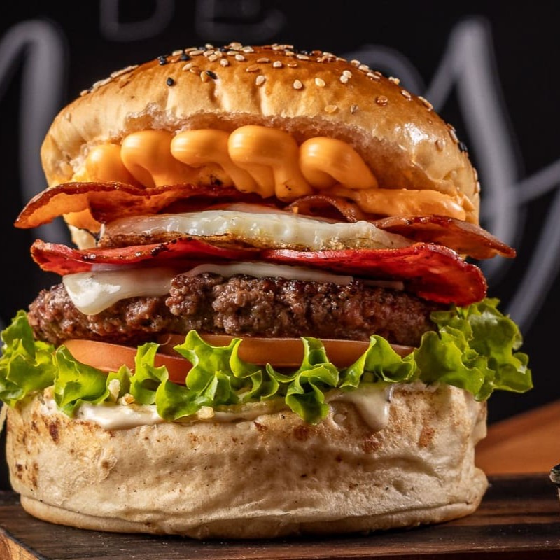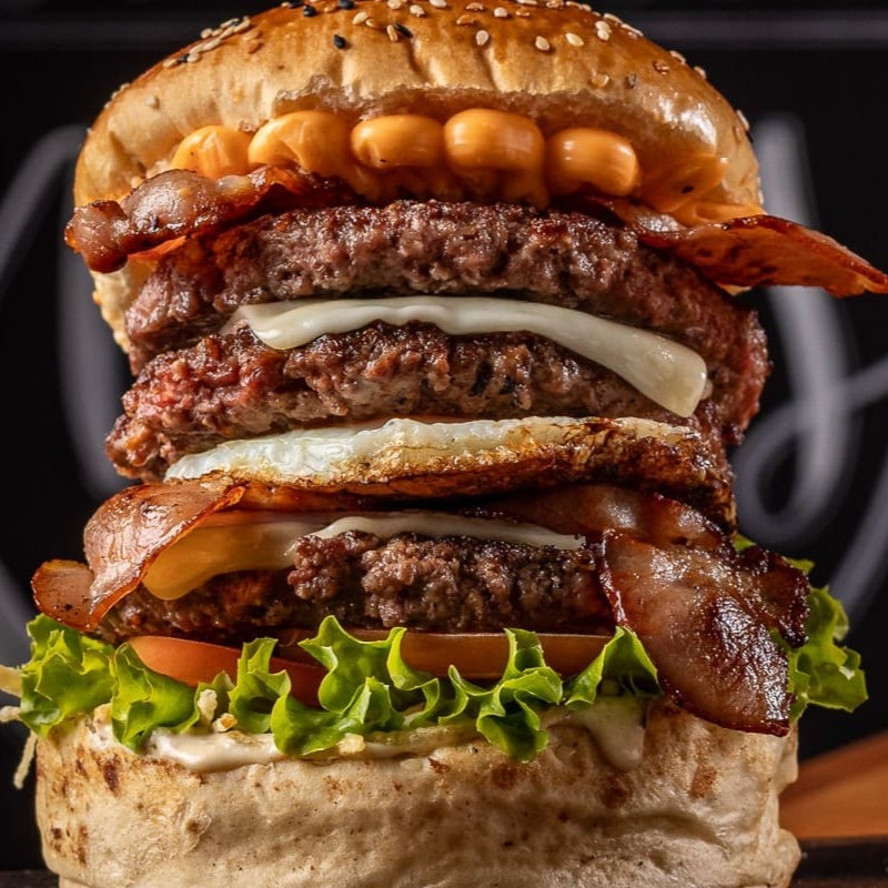 Pão com gergelim, 2 blends artesanais (120g), 2 presuntos, 2 mussarelas, ovo, duplo bacon, cheddar, alface, tomate, batata palha, barbecue e maionese da casa. Acompanha sachê de ketchup, maionese, mostarda e maionese caseira.