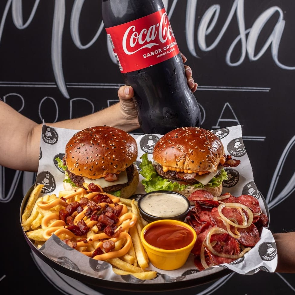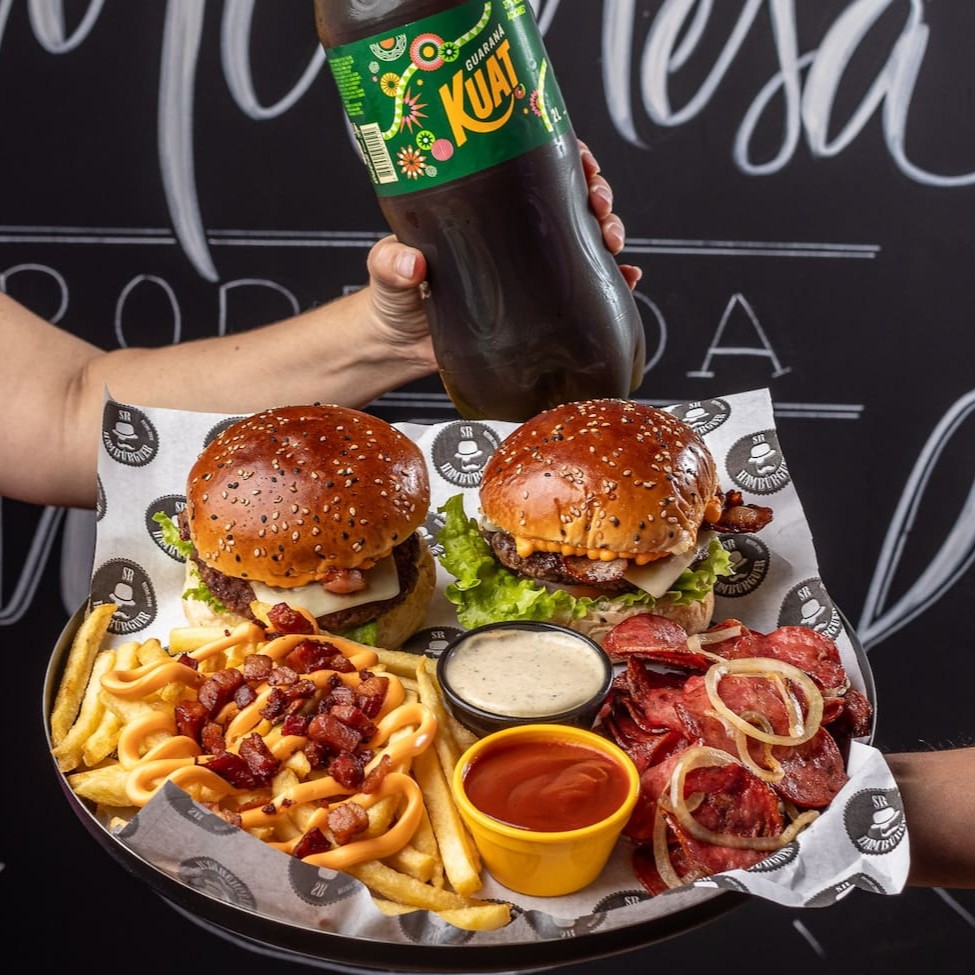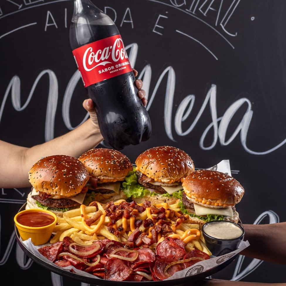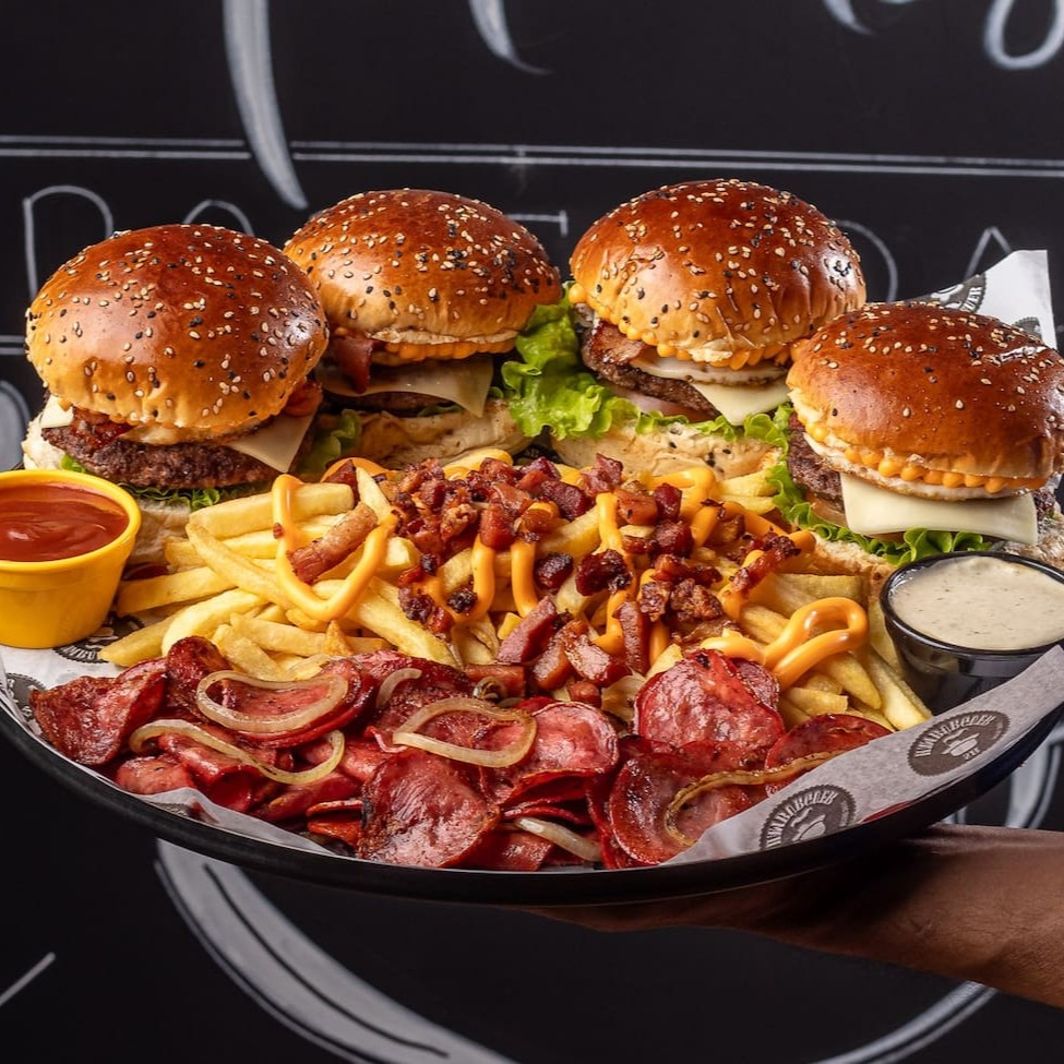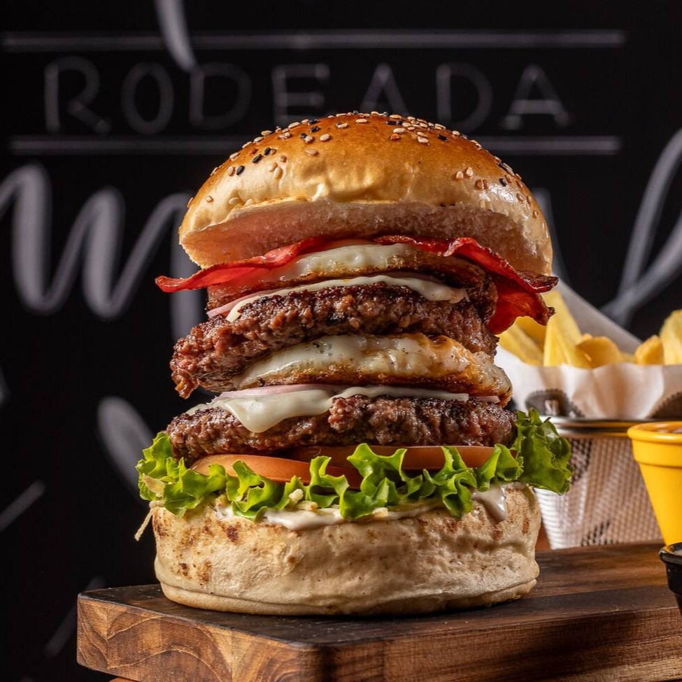 Pão com gergelim, 2 blends artesanais (120g), 2 presuntos, 2 mussarelas, ovo, duplo bacon, cheddar, alface, tomate, batata palha, barbecue e maionese da casa. Acompanha sachê de ketchup, maionese, mostarda e maionese caseira.