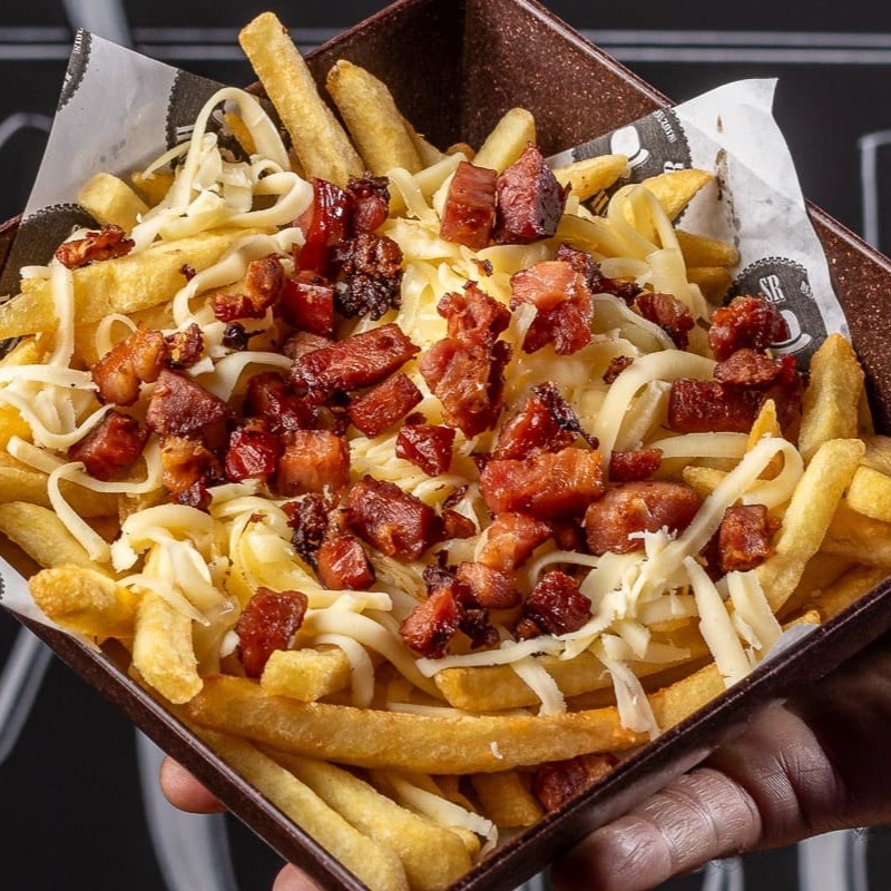 Batata frita 400g com bacon e cheddar, calabresa com cebola 150g.