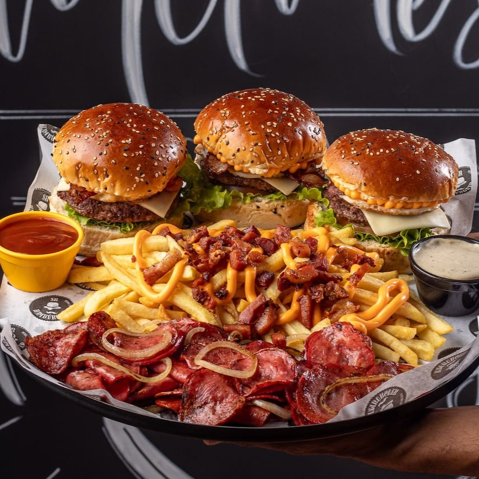 Aprecie o burguer mais vendido da casa acompanhado na caixa com uma deliciosa porção de batata frita (200g), com cheddar cremoso e bacon junto com uma porção de calabresa acebolada (100g), a nossa famosa maionese da casa vai junto com ketchup pra você saborear por completo esse prato. 1 The Best Burguer (Pão macio com gergelim, Carne artesanal de 100g, mussarela, presunto, ovo, Frango desfiado com Catupiry, fatias de bacon, cheddar cremoso, batata palha, alface, tomate, barbecue e maionese da casa.)