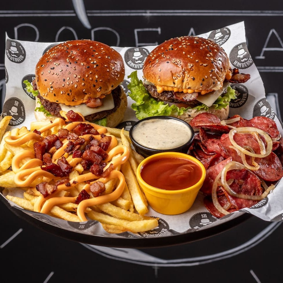 2 Master Burguer - batata frita 300g- bacon - cheddar - calabresa com cebola 120g - ketchup - maionese da casa