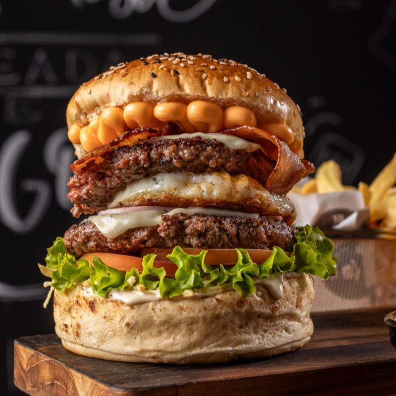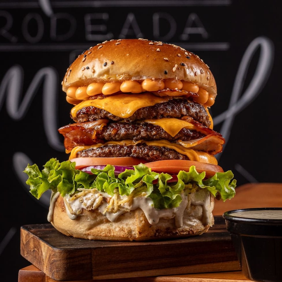Pão macio com gergelim, 3 Carnes artesanais (100g), 3 fatias de queijo prato, Triplo bacon em fatias, muitoo cheddar cremoso , alface, tomate, cebola rocha, batata palha, barbecue, maionese da casa. Acompanha na embalagem: Sachê de ketchup. Maionese, mostarda e maionese da casa (30g).