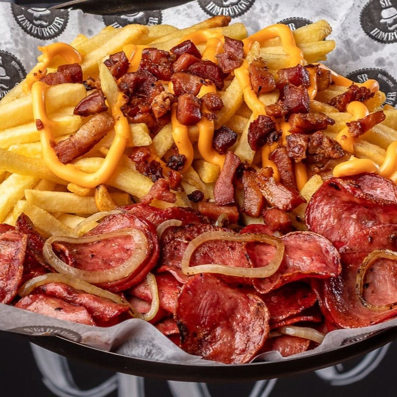 3 Mister Bacon - batata frita 300g- bacon - cheddar - calabresa 120g - cebola - ketchup - maionese da casa