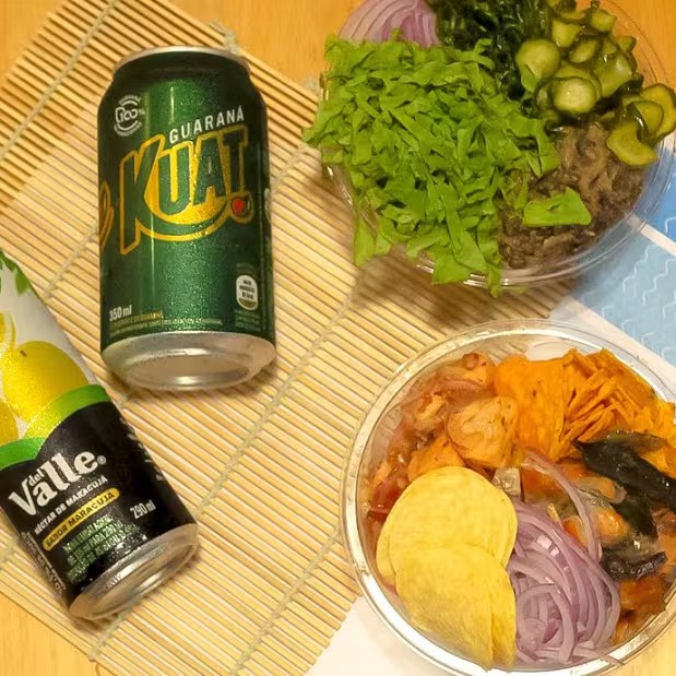 Ceviche de Salmão, arroz japonês, Tortilha/Nacho, skin, cebola roxa, crispy de Pringles.