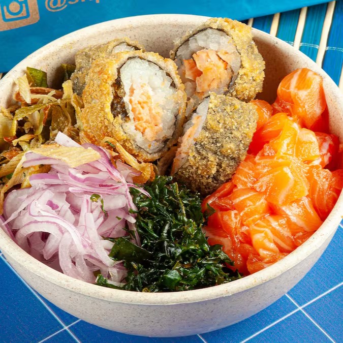 Feito para os amantes de Hot Roll, o Poke Sr. Hot acompanha: Salmão, Hot Filadélfia, Couve Crispy, Cebola Roxa, Crispy de Alho Poró e Molho Teriyaki.