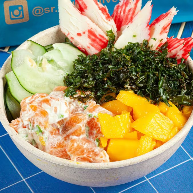 O Poke acompanha: Salmão, Arroz Japonês, Pepino Japonês, Cream Cheese, Abacate e Crispy de Alho Poró.